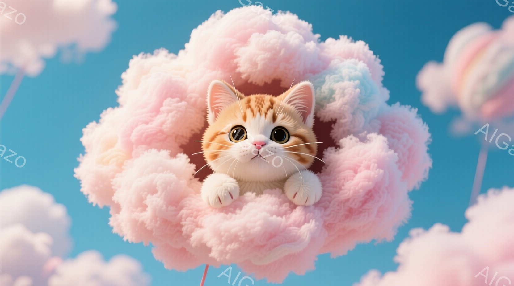 ふわふわとしたピンク色の雲の中に、オレンジと白の縞模様の小さな子猫が浮かんでいます。子猫は前足を雲から出し、丸い目と小さな鼻で可愛らしい表情をしています。背景は明るい青空で、他のピンク色の雲が点在しており、全体的に夢のような、優しい雰囲気を醸し出しています。