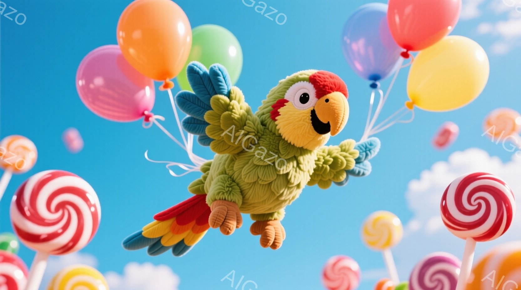 明るい青空を背景に、緑色のふわふわとしたオウムが描かれています。オウムは、複数のカラフルな風船とキャンディーに引かれて空を飛んでおり、楽しげな表情をしています。全体的に、甘くて夢のような、遊び心あふれる雰囲気が漂っています。