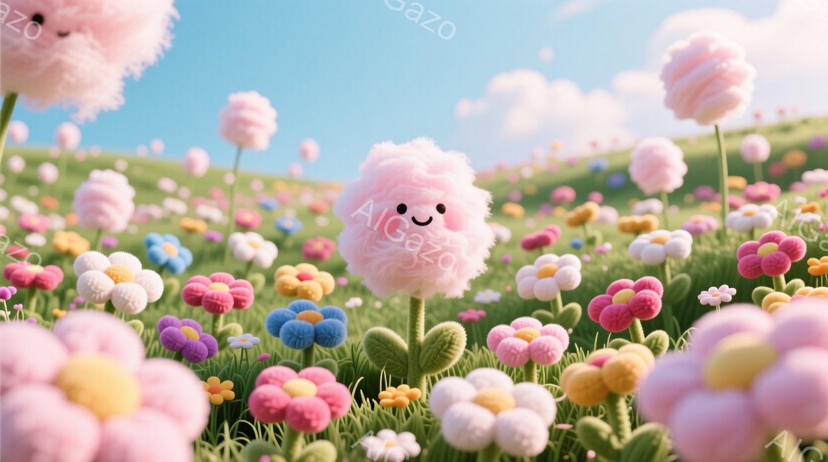 ふわふわとした綿菓子のような花々が広がる草原が描かれています。中央には、笑顔の表情をした、綿菓子のような姿のキャラクターが茎の上に立っており、可愛らしい印象を与えます。背景には穏やかな空と緑の丘が見え、全体的に夢のような、優しい雰囲気です。