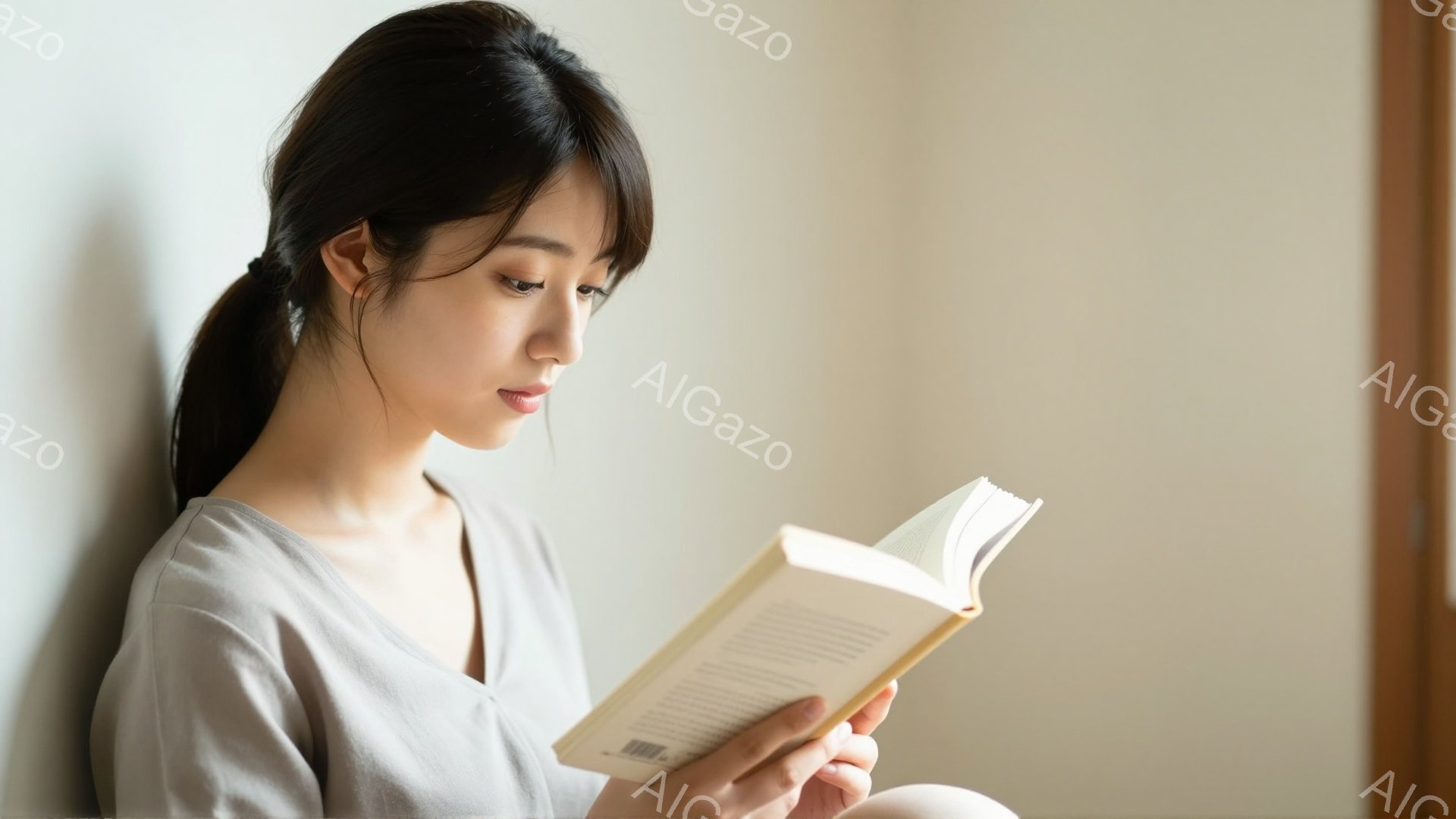 「長い黒髪の女性が椅子に座って本を読んでいます。白いシャツを着ており、リラックスした表情で、集中して本の内容を追っている様子が伺えます。背景は明るい壁と窓があり、」は、2025年12月04日に作成されたAI生成画像です。 リラックスをテーマとした高品質なビジュアル素材で、 1920×1080px の解像度で提供しています。 個人利用・商用利用ともに無料でダウンロード可能で、クレジット表記も不要です。