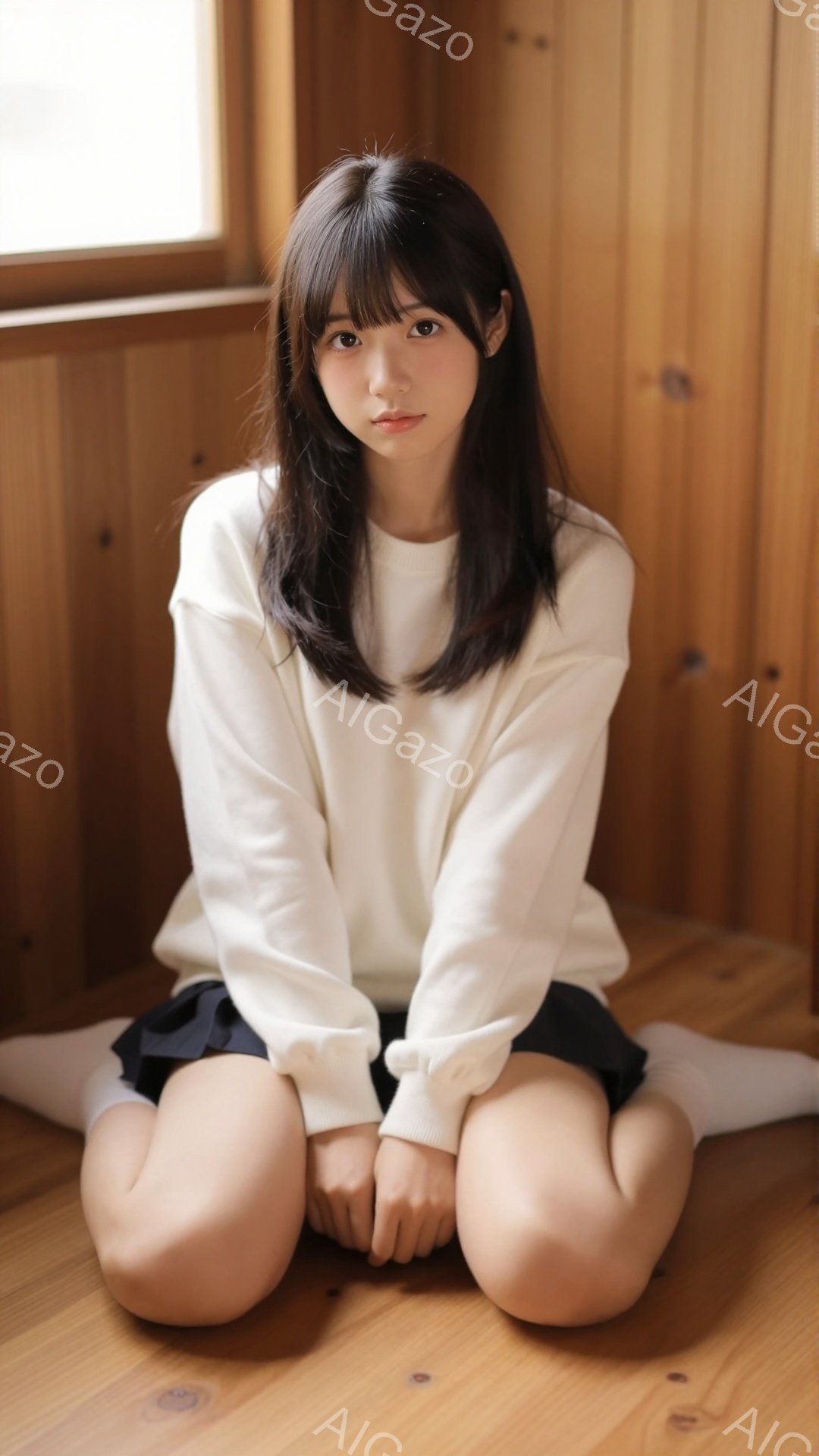 長い黒髪の女性が、白いセーターと紺色のプリーツスカートを身につけて、畳の上に座っています。彼女は少し微笑んでおり、穏やかな表情をしています。背景は木製の壁で、窓から自然光が差し込み、温かく落ち着いた雰囲気を醸し出しています。