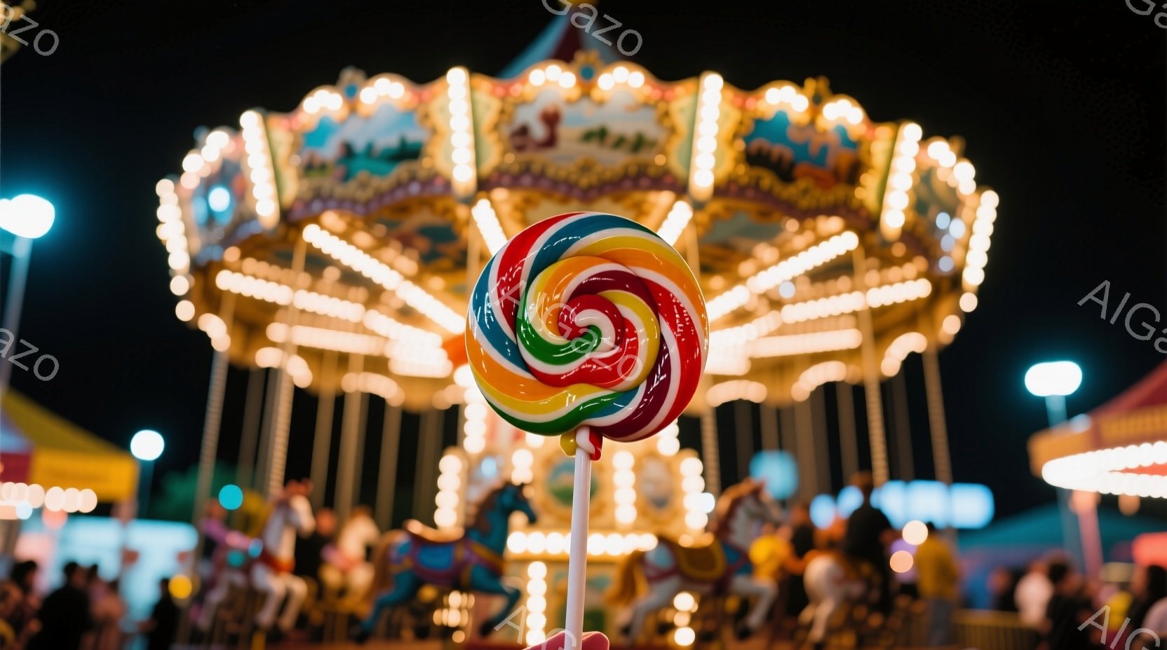 夜空を背景に、鮮やかな色彩の巨大なキャンディが手前に大きく配置され、その奥に遊園地の回転木馬がぼんやりと光っている。回転木馬は、様々な動物の形をした乗り物が、暖かい光で照らされ、夜の闇の中で幻想的な雰囲気を醸し出している。全体の雰囲気は、楽しさと夢のような幸福感に満ちている。