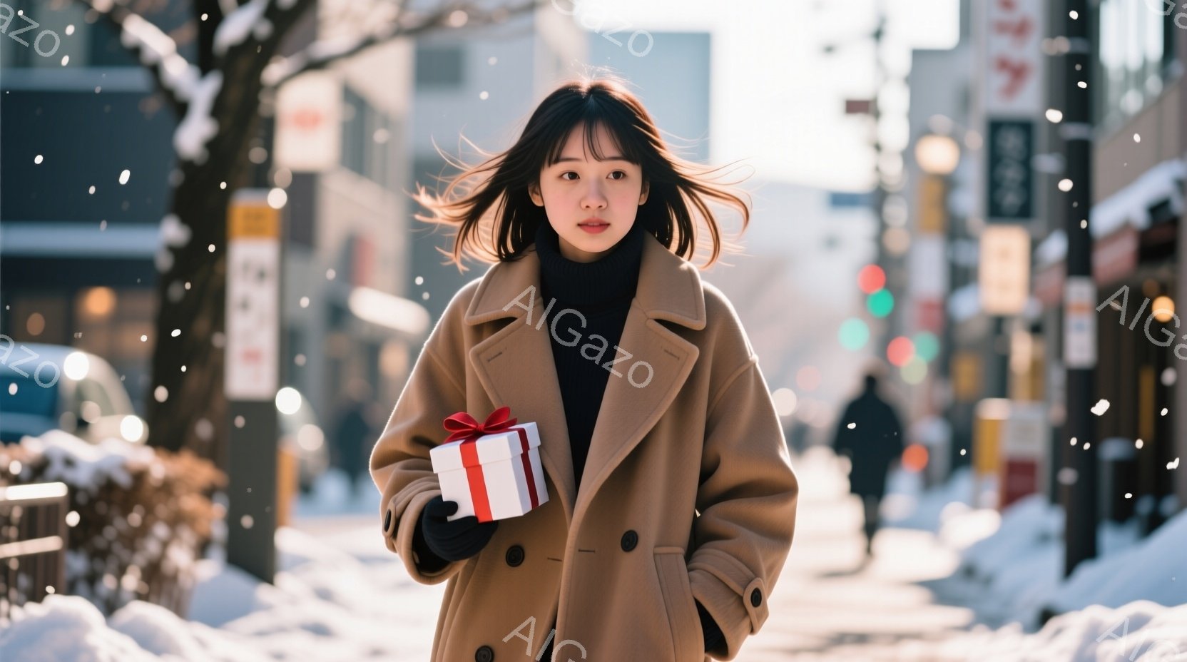 長い髪をセンターパートにした若い女性が、ベージュ色のコートを着て、片手に赤いリボンで結ばれたプレゼントの箱を持っています。彼女はカメラの方を見て微笑んでおり、冬の街並みが背景に広がっています。雪が積もった木々や建物、そして薄暗い空気が、静かで温かい雰囲気を醸し出しています。