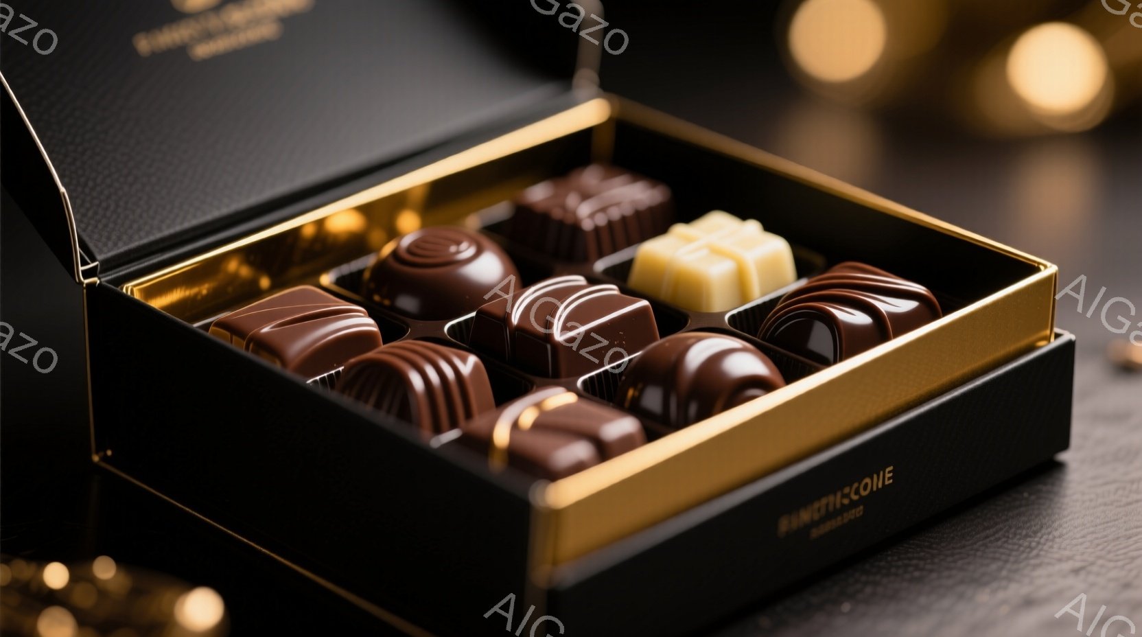 チョコレートが丁寧に包装された箱が写っています。様々な形と色のチョコレートが、金色の縁取りのある黒い箱の中に整然と並べられています。背景はぼかされており、高級感と洗練された雰囲気を醸し出しています。