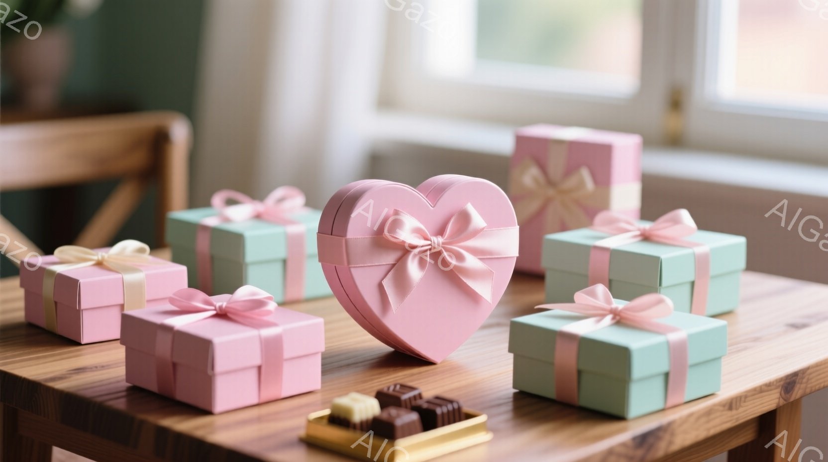 淡いピンクと水色のギフトボックス、バラ、チョコレートが、レースのドイリーの上に美しく配置されています。ハート型のピンクの箱には、光沢のあるリボンが結ばれており、周囲にはバラの花と、茶色とクリーム色のチョコレートが並べられています。全体的に、ロマンチックで優雅な雰囲気が漂う、バレンタインや記念日を彷彿とさせるイメージです。