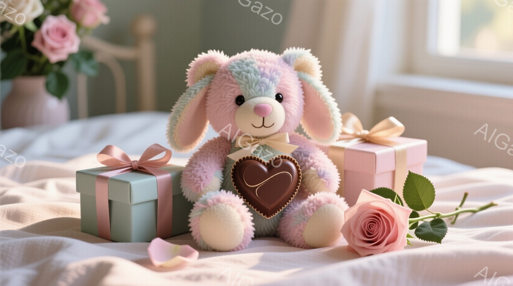 ふわふわのピンクと水色の毛並みのテディベアが、チョコレート色のハートのチャームをつけたリボンで飾られています。ベアはプレゼントボックスの山の上に座っており、その周りにはピンク色のバラが添えられています。背景はぼやけており、柔らかな光が差し込んでおり、全体的に甘くロマンチックな雰囲気を醸し出しています。