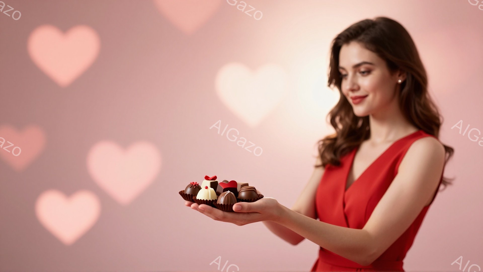 明るい赤色のドレスを着た女性が、片手にチョコレートが並んだトレーを持っている。彼女は少し微笑み、チョコレートを見つめている。背景はぼやけたピンク色で、ハート型の光のぼかしがいくつかあり、ロマンチックで甘い雰囲気を醸し出している。