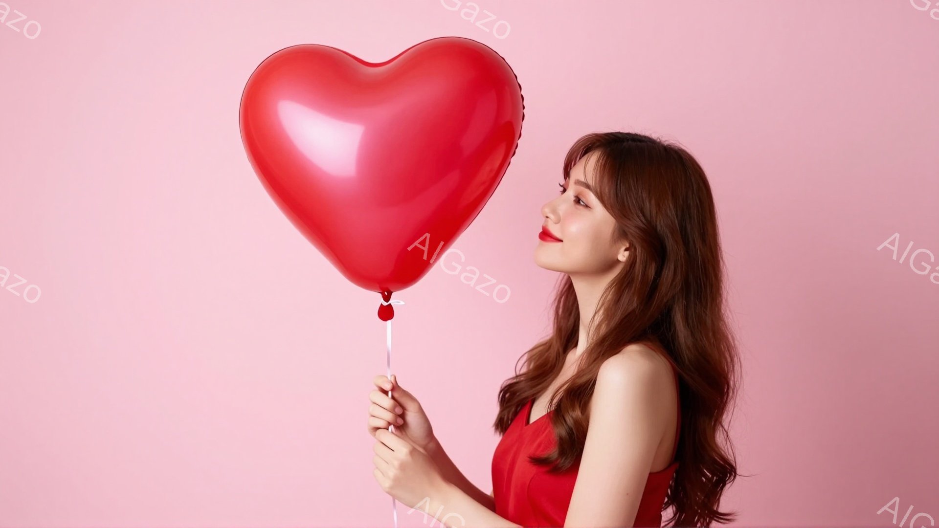 赤いワンピースを着た女性が、ハート型の赤い風船を持っています。彼女は少し上目線で風船を見て微笑んでおり、髪はゆるくウェーブがかかっています。背景は明るいピンク色で、全体的にロマンチックで優しい雰囲気です。