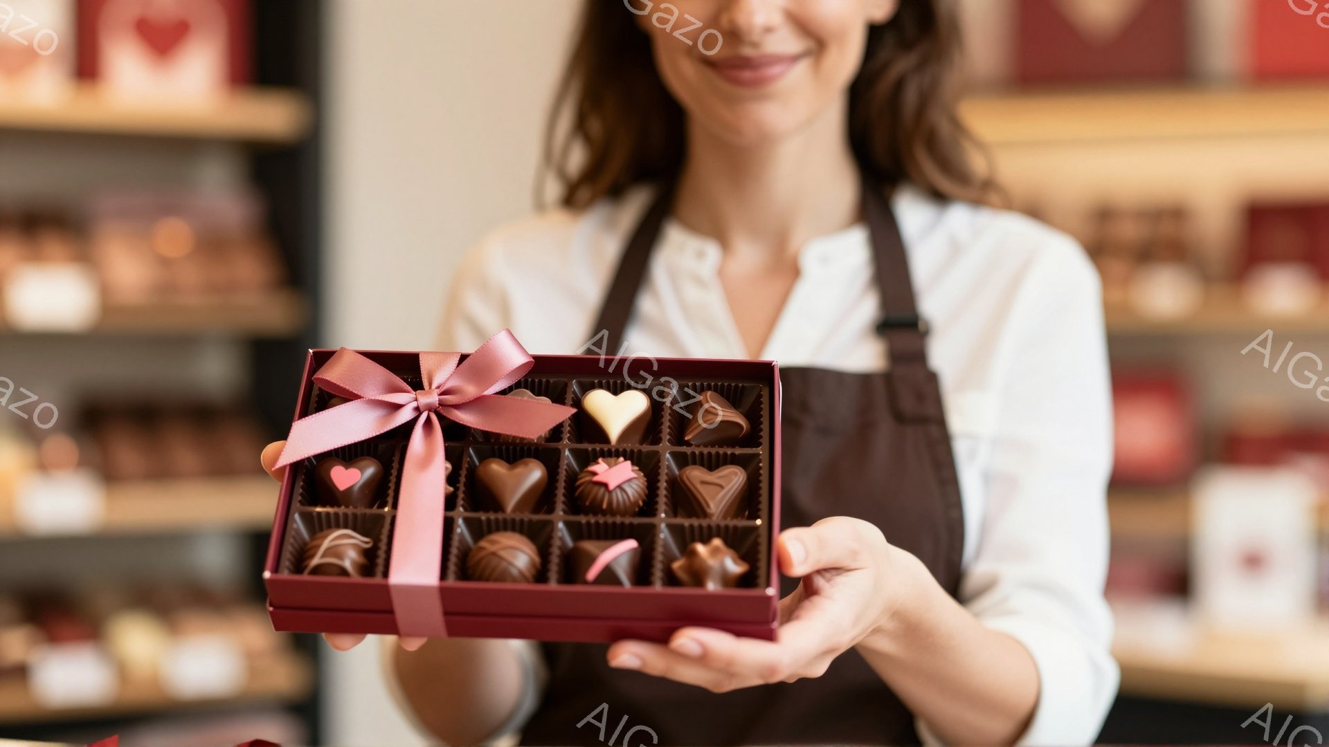 女性がチョコレートが入った赤い箱を両手で差し出している様子が写っている。彼女は白い長袖シャツと黒いエプロンを着ており、髪は肩にかかる長さで、明るい笑顔を浮かべている。背景にはチョコレートが並んだ棚があり、店内は明るく、温かい雰囲気が漂っている。