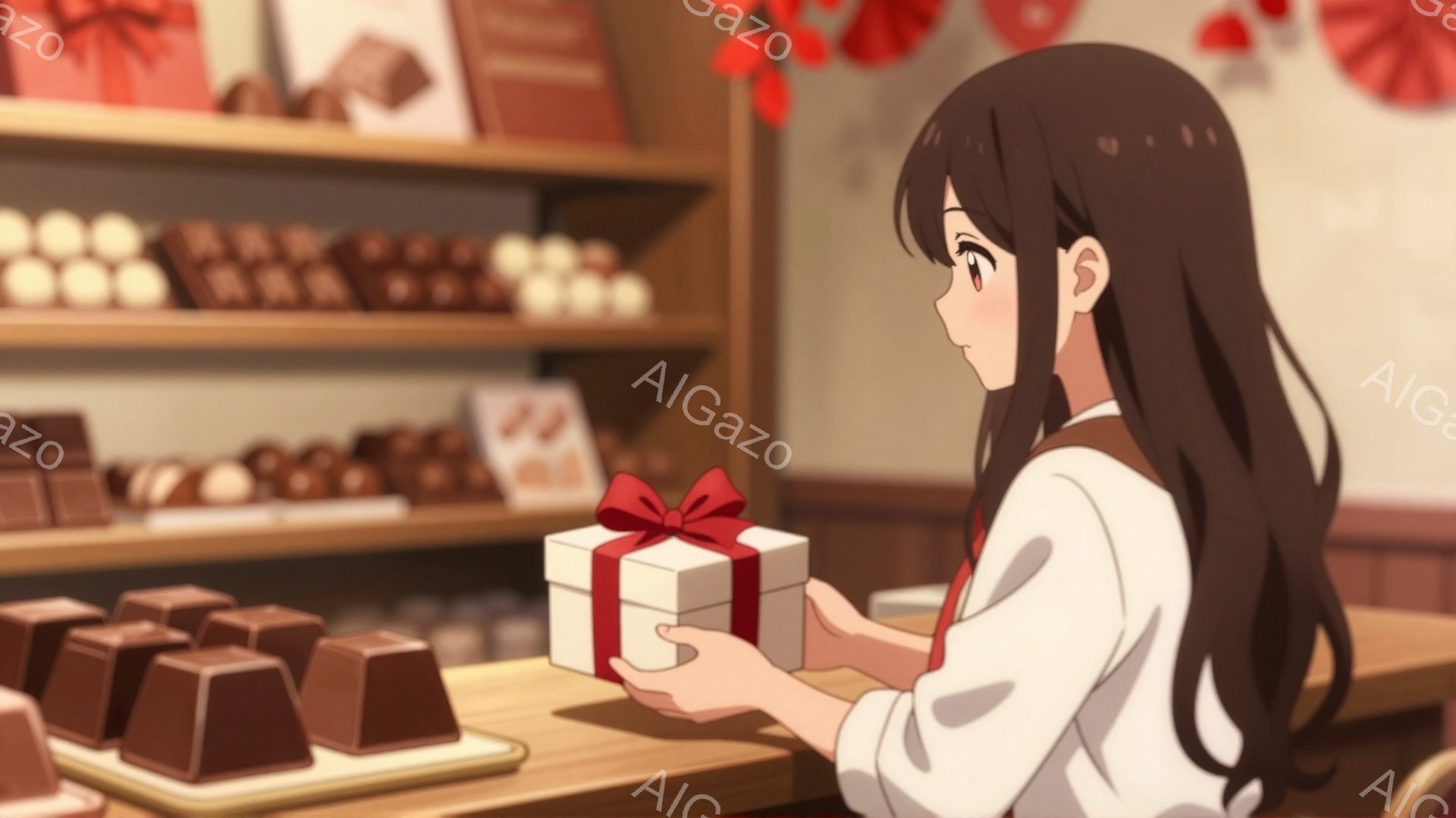 長い黒髪を背中に垂らし、白いブラウスと茶色のスカートを身に着けた女性が、リボンで飾られた白いギフトボックスを両手で持っています。彼女は少し顔を傾け、どこかを見つめるような表情をしています。背景にはチョコレートが並んだ棚があり、まるでチョコレート店のような雰囲気です。
