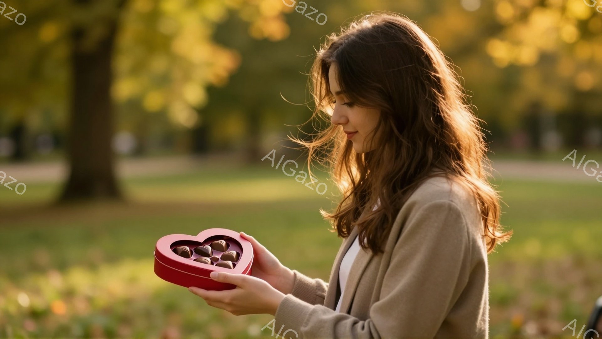 長い巻き毛の女性が、赤いハート型のギフトボックスを両手で抱えています。彼女はクリーム色のセーターとジーンズを着ており、柔らかい表情で箱を見つめています。背景には木々が並び、落ち葉が散らばる遊歩道で、穏やかで優しい雰囲気が漂っています。