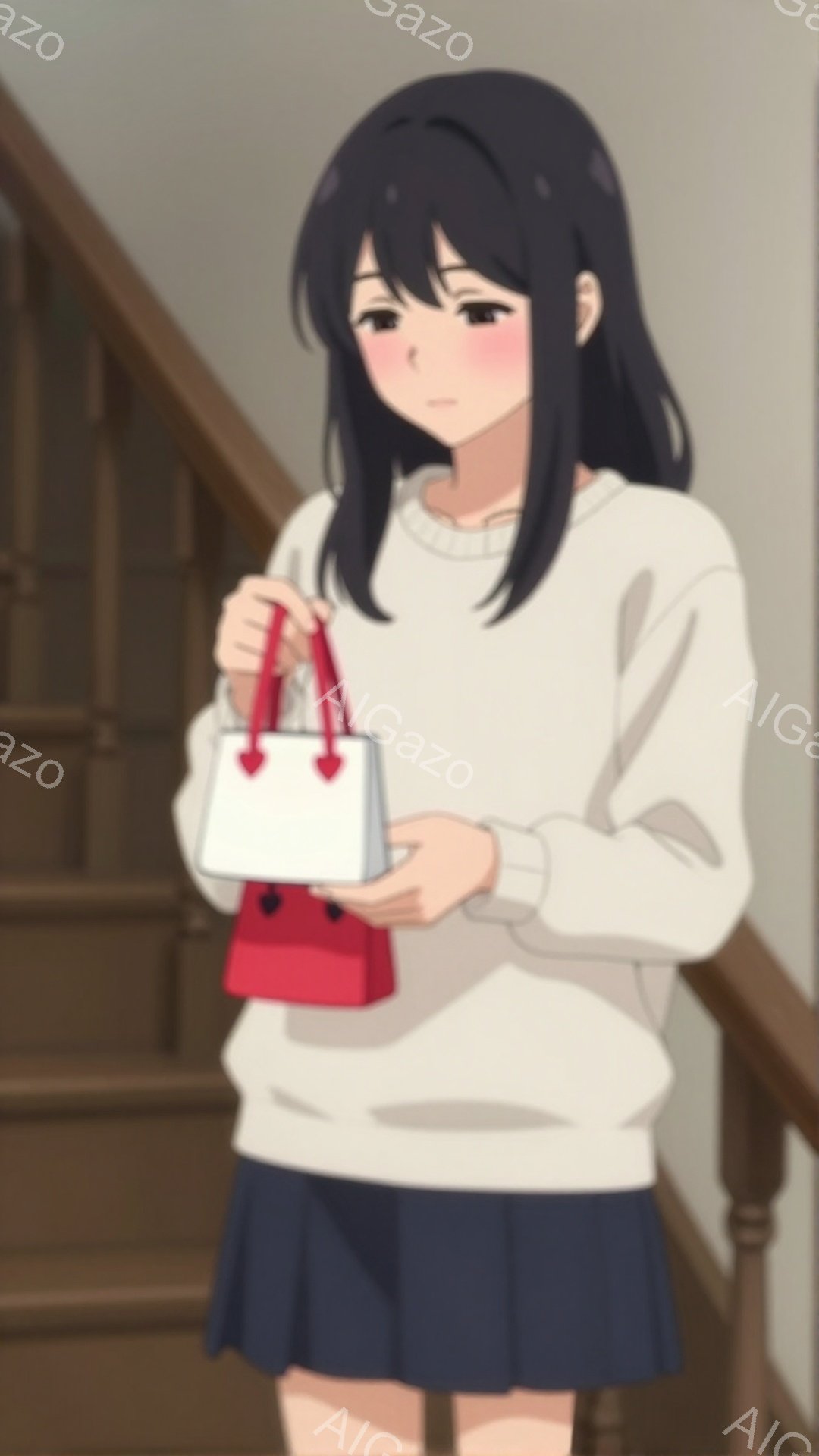 黒髪の少女が階段に立っている。白いセーターと紺色のスカートを着用し、赤いハンドバッグを持っています。表情は穏やかで、少し微笑んでいるように見えます。