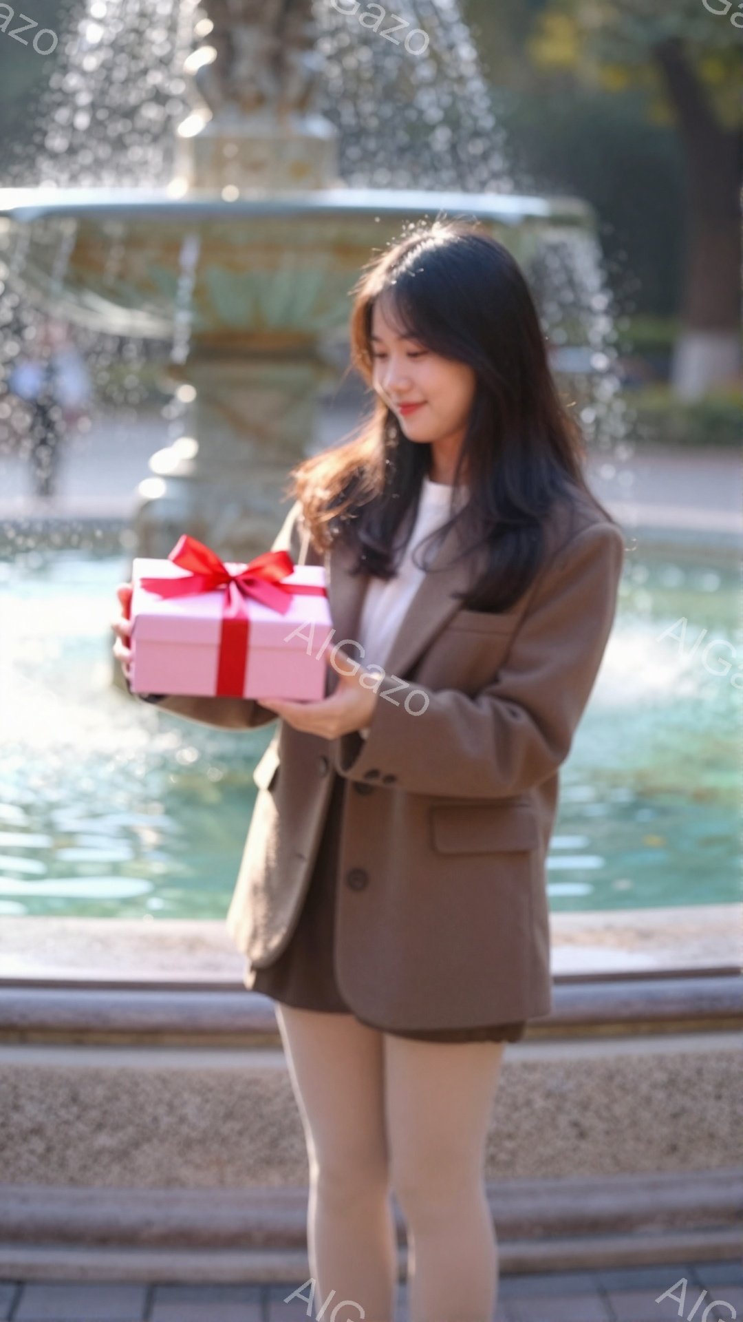 黒いコートとスカート、黒いタイツと靴を身に着けた若い女性が、赤いリボンで飾られた白いギフトボックスを両手で前に差し出しています。彼女は肩までの長さの黒髪で、控えめな微笑みを浮かべています。背景には彫刻が施された噴水があり、晴れた日の穏やかな雰囲気です。