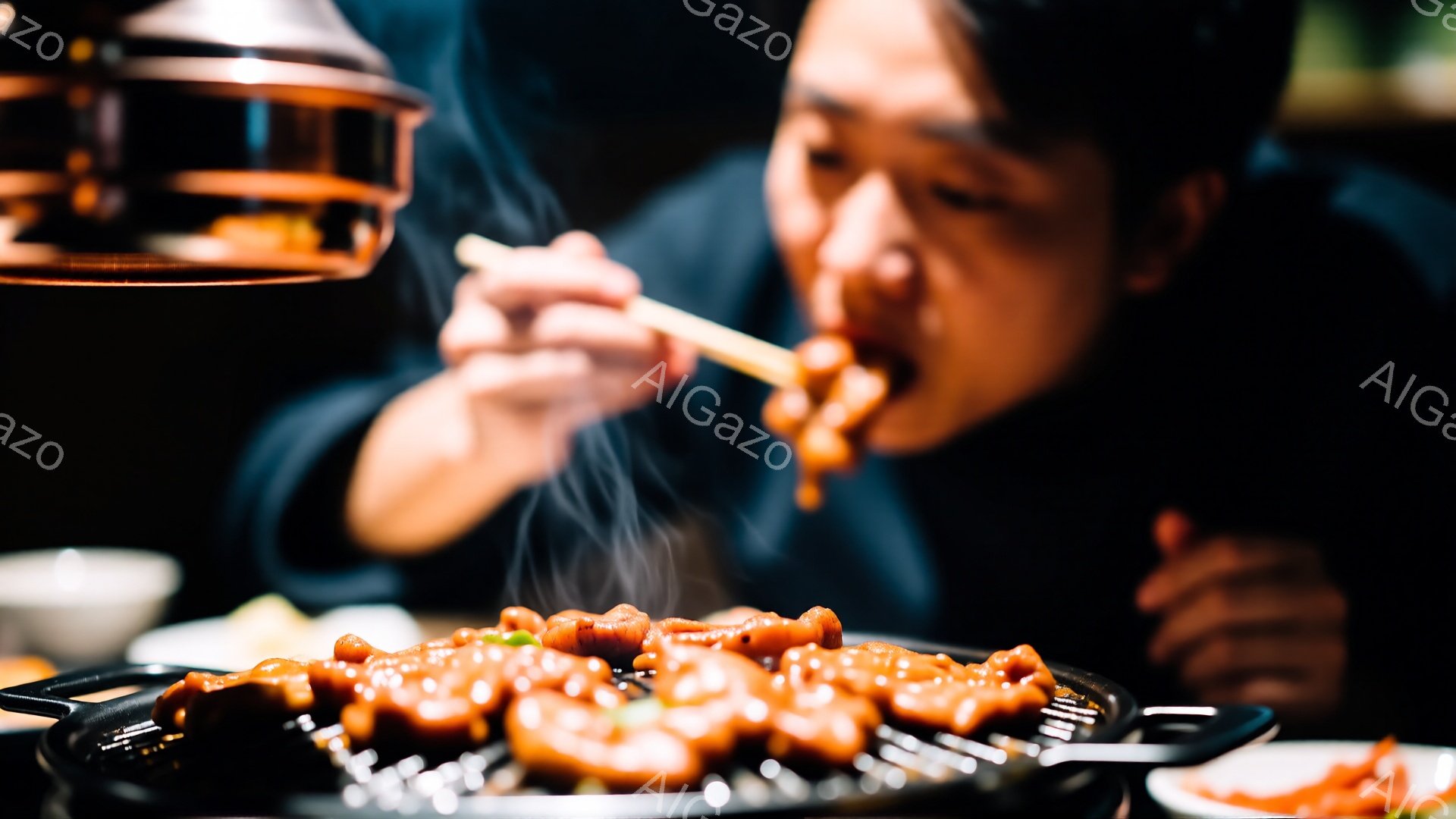 焦点は、艶やかな焼き色のステーキが盛られた白い皿に当てられています。背景には、ぼやけた人物がおり、黒いシャツを着ています。全体的に暖色系の照明が使われ、レストランのような落ち着いた雰囲気が漂っています。