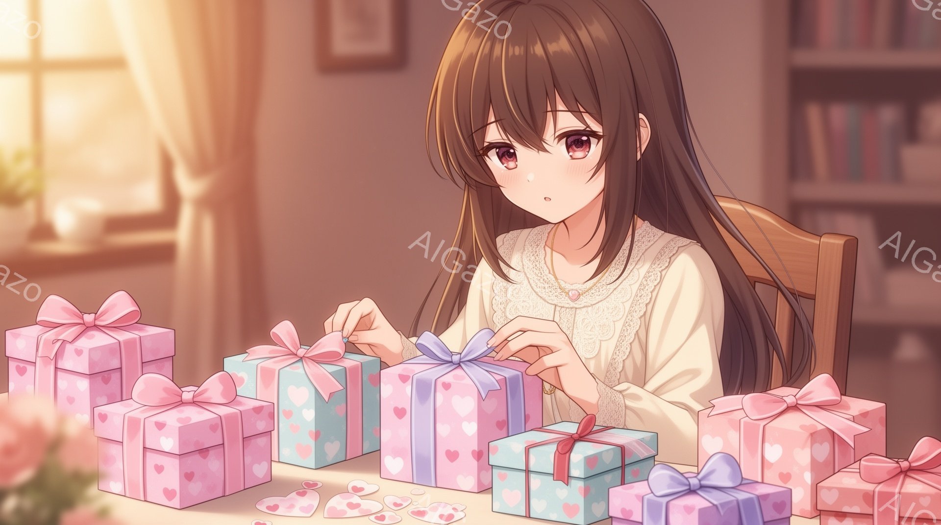 茶色の髪をハーフアップにした少女が、リボンで結ばれたプレゼントボックスを手にしています。彼女は明るいピンク色のワンピースを着ており、優しい笑顔を浮かべています。背景には本棚と窓があり、温かく穏やかな雰囲気です。