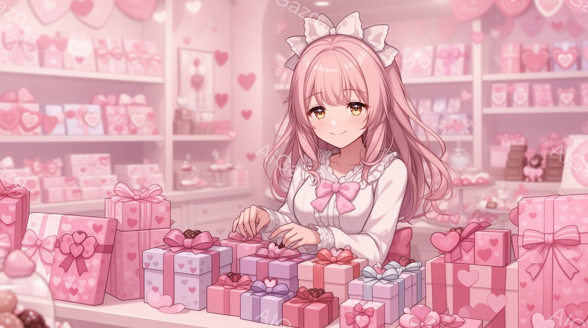 明るい茶色の髪をハーフアップにした若い女性が、ピンク色のギフトボックスを積み重ねています。彼女はフリル付きの白いブラウスとピンク色のスカートを着ており、明るい笑顔を浮かべています。背景には、ハート型の装飾やギフトボックスが溢れ、バレンタインデーらしい甘くロマンチックな雰囲気が漂っています。