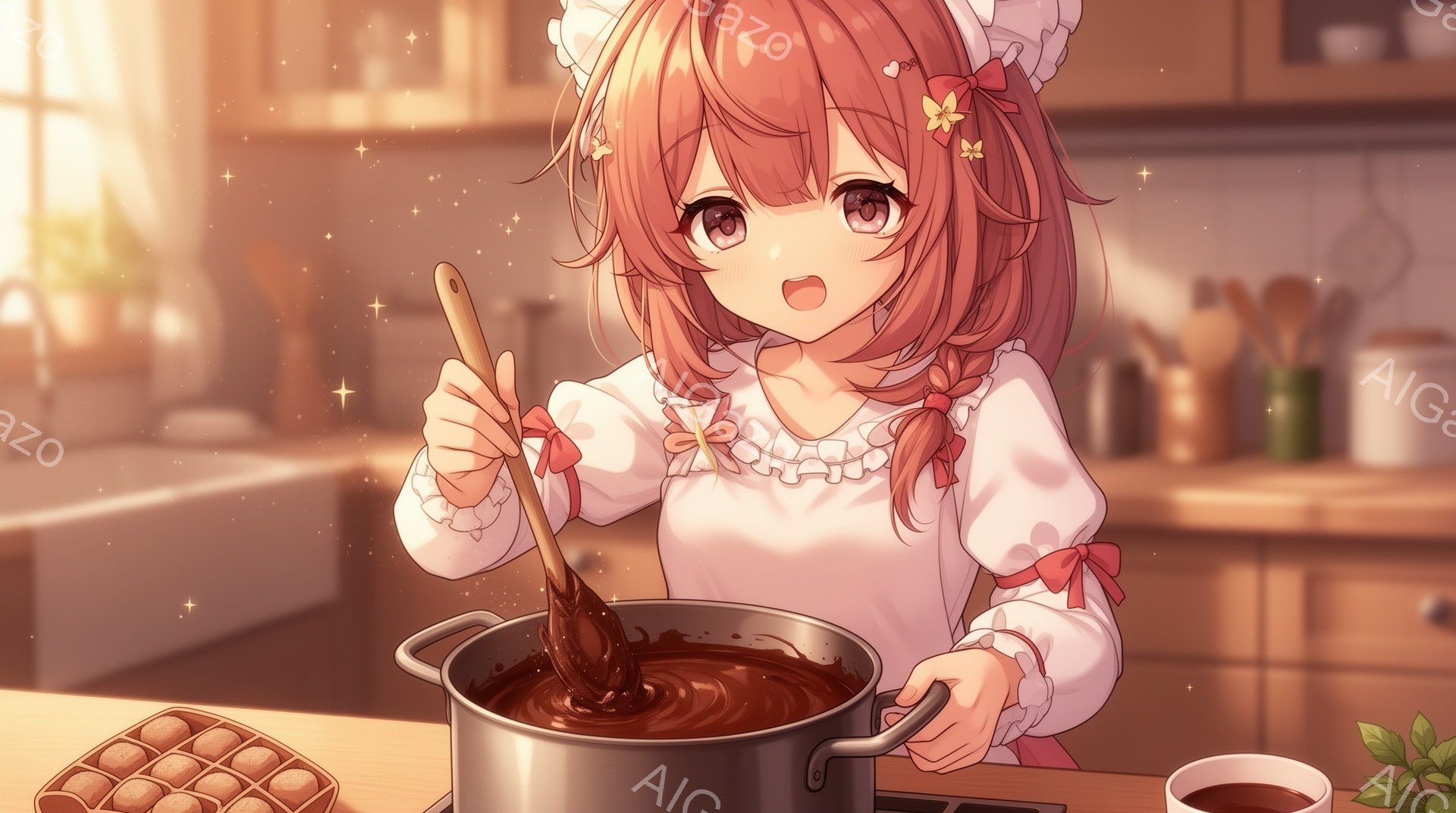 「長いピンク色の髪に白いエプロンをつけた若い女性が、鍋の中身を木べらで混ぜています。彼女は目を細め、幸せそうな笑顔を浮かべており、キッチンで何かを調理している様子」は、2025年12月06日に作成されたAI生成画像です。 エプロンをテーマとした高品質なビジュアル素材で、 1920×1072px の解像度で提供しています。 個人利用・商用利用ともに無料でダウンロード可能で、クレジット表記も不要です。