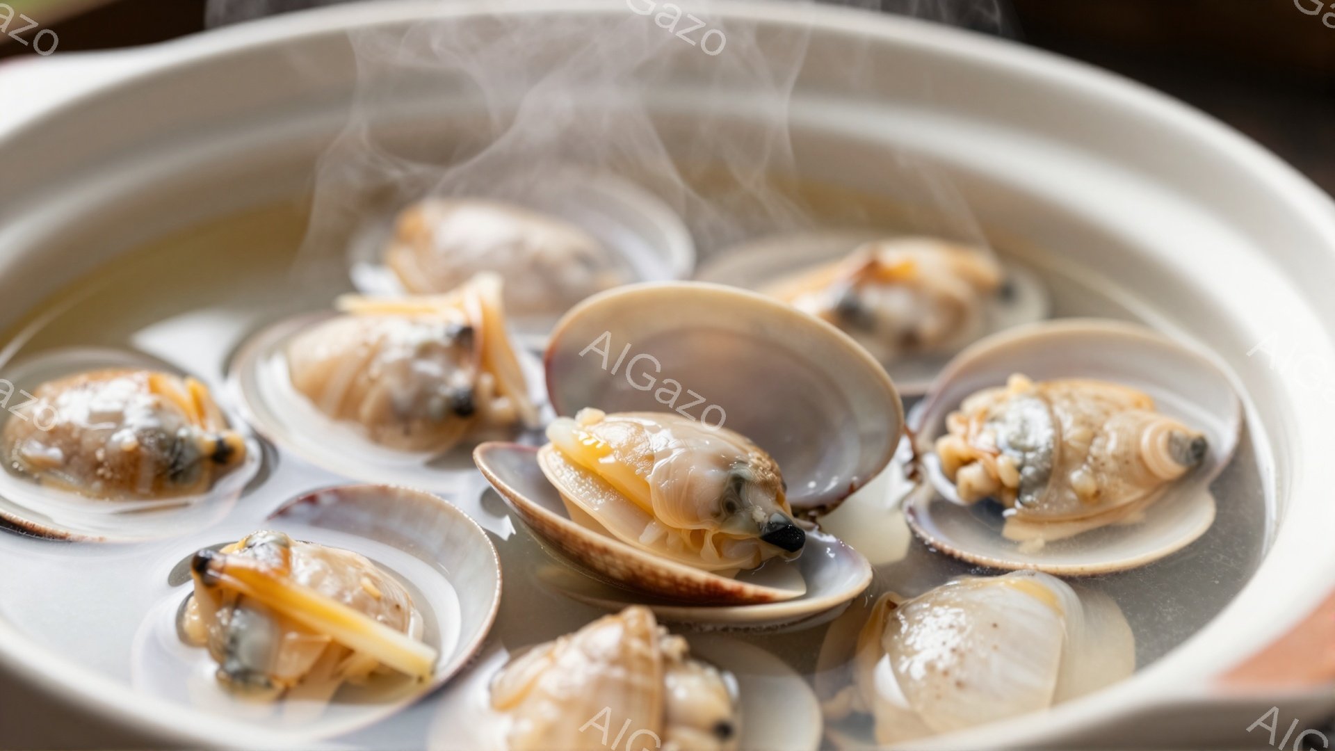 「鍋の中にアサリがたっぷり煮込まれており、湯気が立ち上っている様子が写っている。アサリの殻は鮮やかな模様があり、中身はふっくらとしていて美味しそうだ。鍋は白く、シ」は、2025年12月06日に作成されたAI生成画像です。 アサリをテーマとした高品質なビジュアル素材で、 1920×1080px の解像度で提供しています。 個人利用・商用利用ともに無料でダウンロード可能で、クレジット表記も不要です。