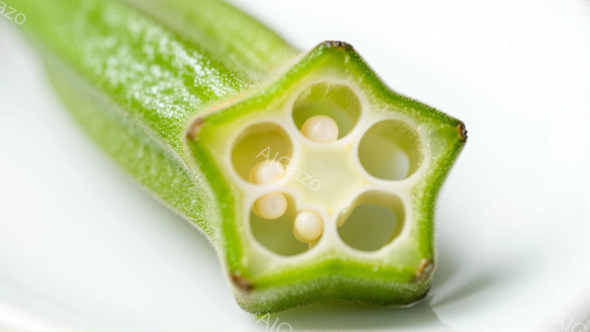 緑色のオクラが横に切られており、内部の種子がはっきりと見えます。種子は白っぽく、繊維質の構造が確認できます。背景は白く、オクラの色が際立っています。