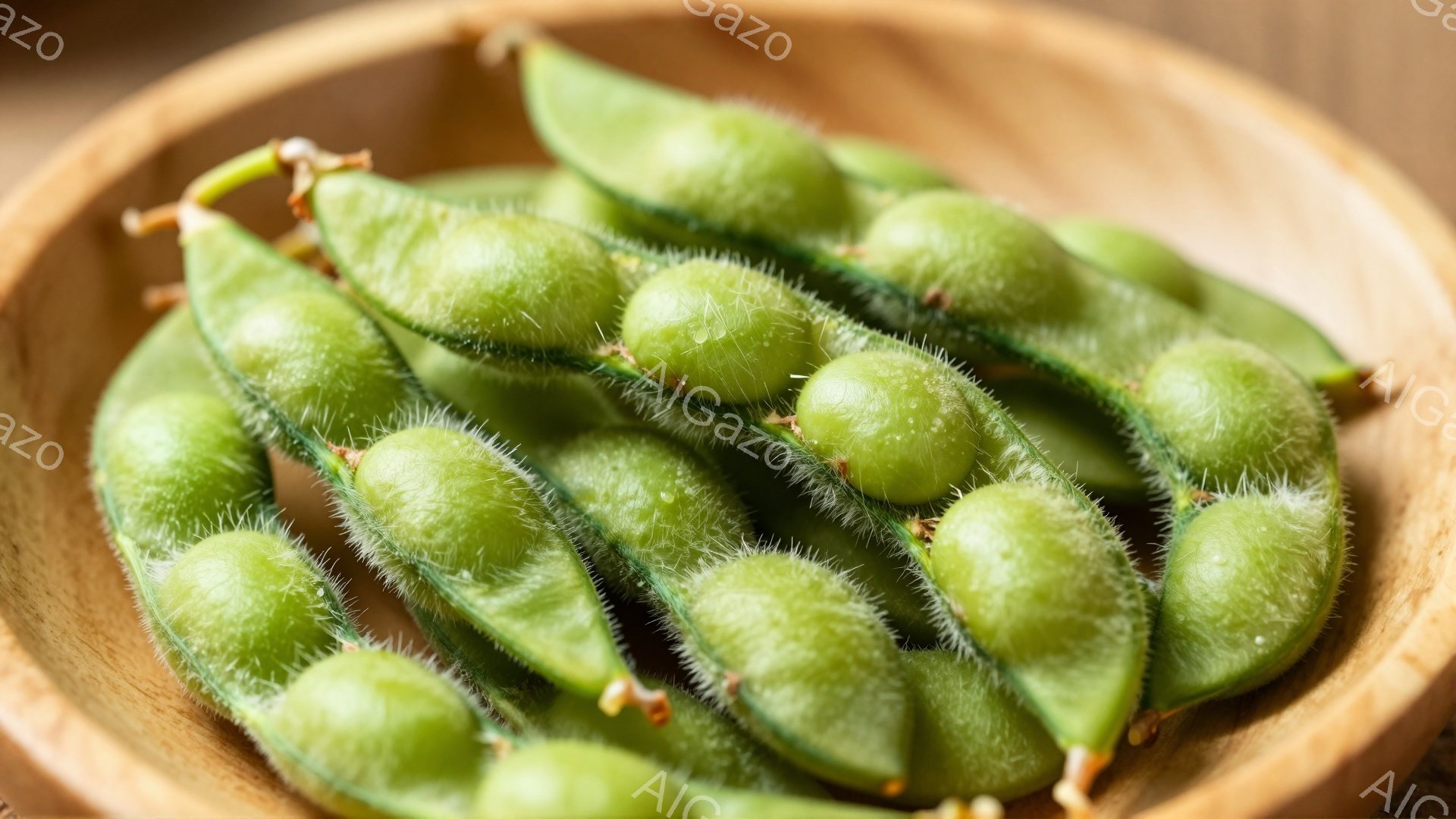 浅い木製の器に、枝豆が山のように盛られています。豆は鮮やかな緑色で、表面には細かい毛がみられ、みずみずしさが感じられます。背景はぼかされており、豆の色と質感が際立っています。