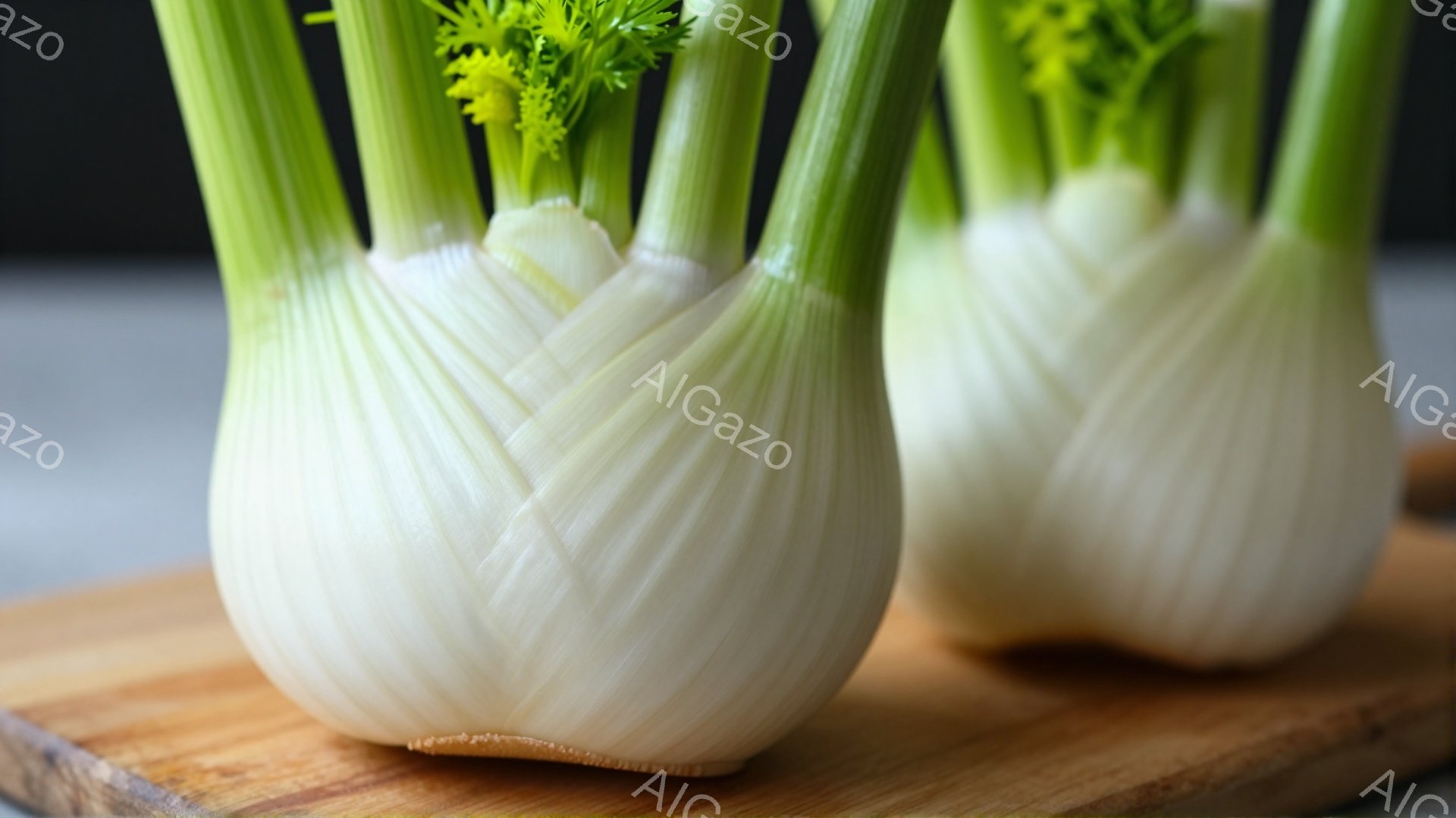 「画像は、木製のまな板の上に置かれたフェンネルの球根のクローズアップです。白く緑がかった球根は独特の層状の模様を持ち、緑色の茎が上部から伸びています。背景はぼやけ」は、2025年12月07日に作成されたAI生成画像です。 キッチンをテーマとした高品質なビジュアル素材で、 1920×1080px の解像度で提供しています。 個人利用・商用利用ともに無料でダウンロード可能で、クレジット表記も不要です。