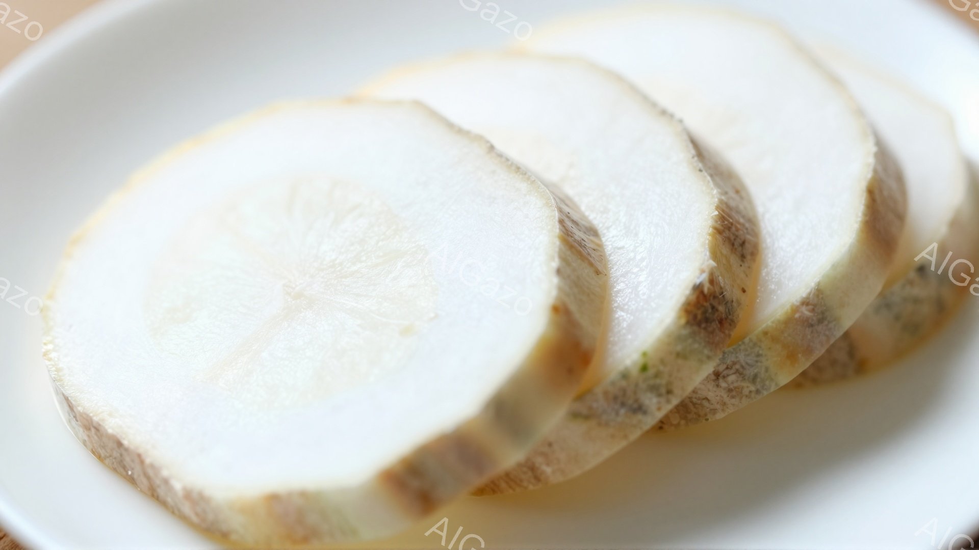 「白い皿の上に、薄くスライスされた大根が並んでいます。大根は半透明で、中央に小さな芯が見えます。背景はぼかされており、シンプルな料理のプレゼンテーションに集中して」は、2025年12月07日に作成されたAI生成画像です。 シンプルをテーマとした高品質なビジュアル素材で、 1920×1080px の解像度で提供しています。 個人利用・商用利用ともに無料でダウンロード可能で、クレジット表記も不要です。