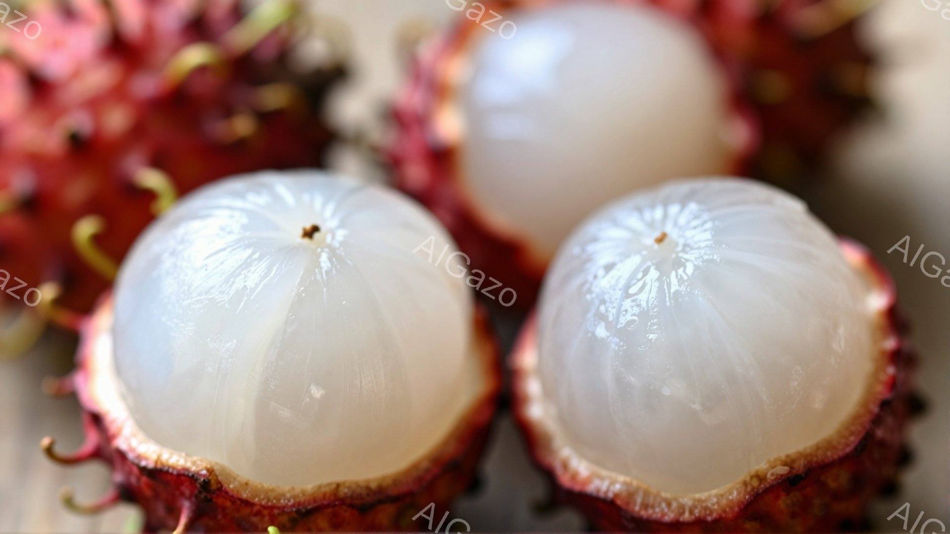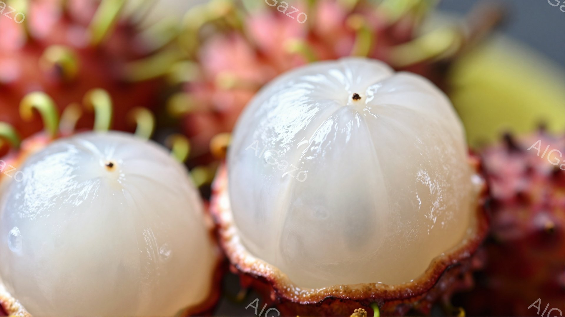 「鮮やかな赤い竜眼の殻に囲まれた、2つの白いライチの断面がクローズアップで捉えられています。ライチの果肉は半透明で、水分を含んでおり、中央には小さな種が確認できま」は、2025年12月07日に作成されたAI生成画像です。 クローズアップをテーマとした高品質なビジュアル素材で、 1920×1080px の解像度で提供しています。 個人利用・商用利用ともに無料でダウンロード可能で、クレジット表記も不要です。