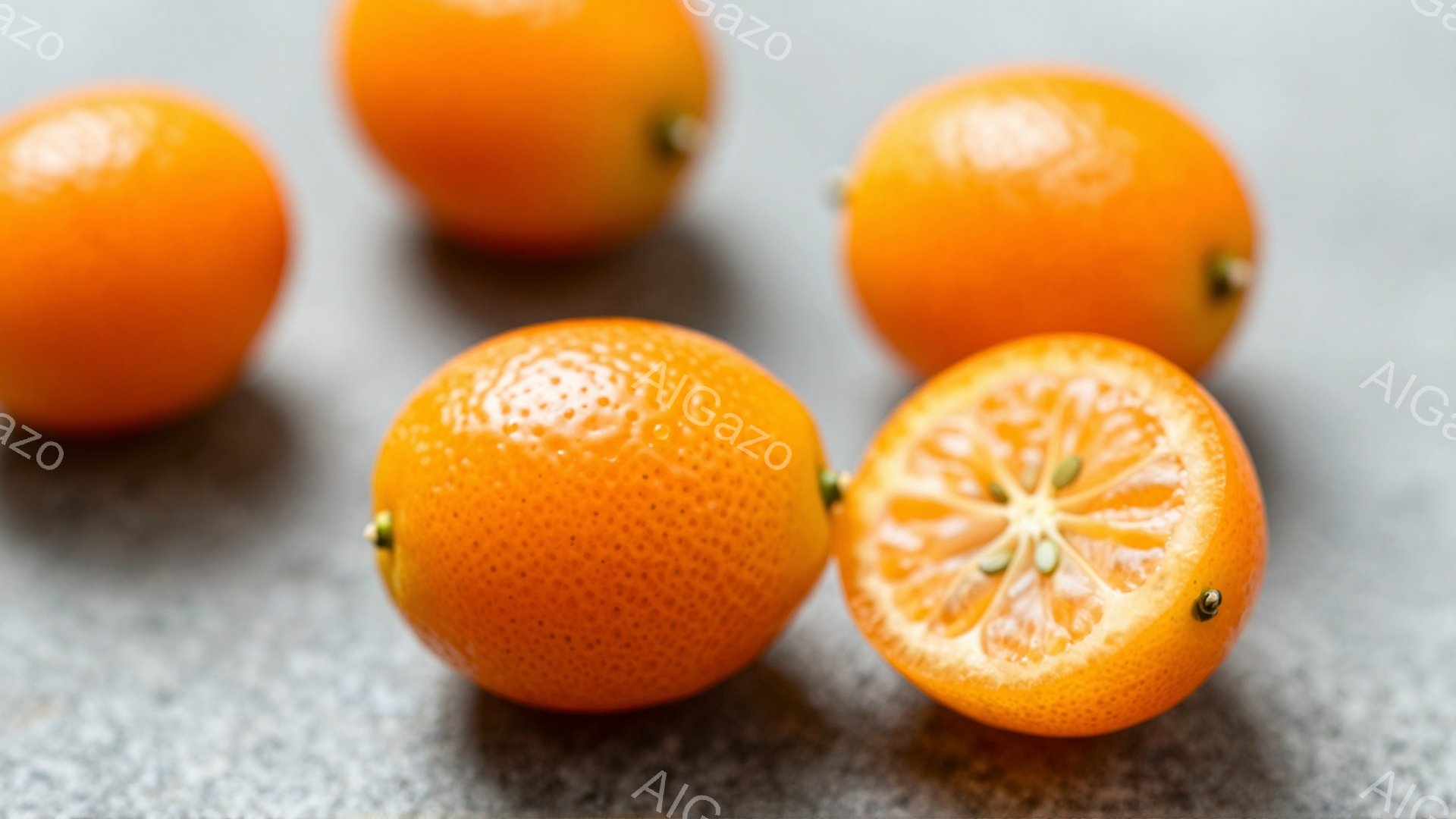 画像には、数個の小さなオレンジ色の柑橘類が、グレーの表面に散らばって配置されています。果物には緑色の茎がついており、テクスチャはざらざらとしていて、全体的に新鮮で自然な雰囲気を醸し出しています。光の当たり方から、果物が立体的に見え、視覚的な深みを与えています。