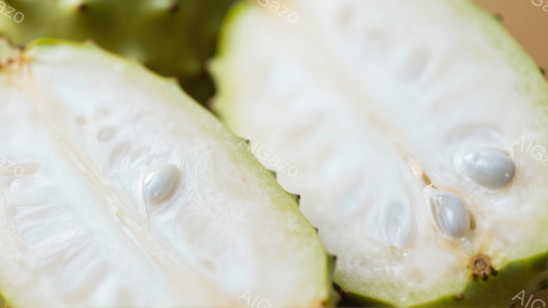 鮮やかな緑色の外皮を持つ熱帯のフルーツ、シャリザの断面がクローズアップで捉えられています。白い果肉には黒い種子が散りばめられており、独特の形状が際立っています。背景にはわずかに外皮の一部が見え、光沢のある質感と複雑な凹凸が確認できます。
