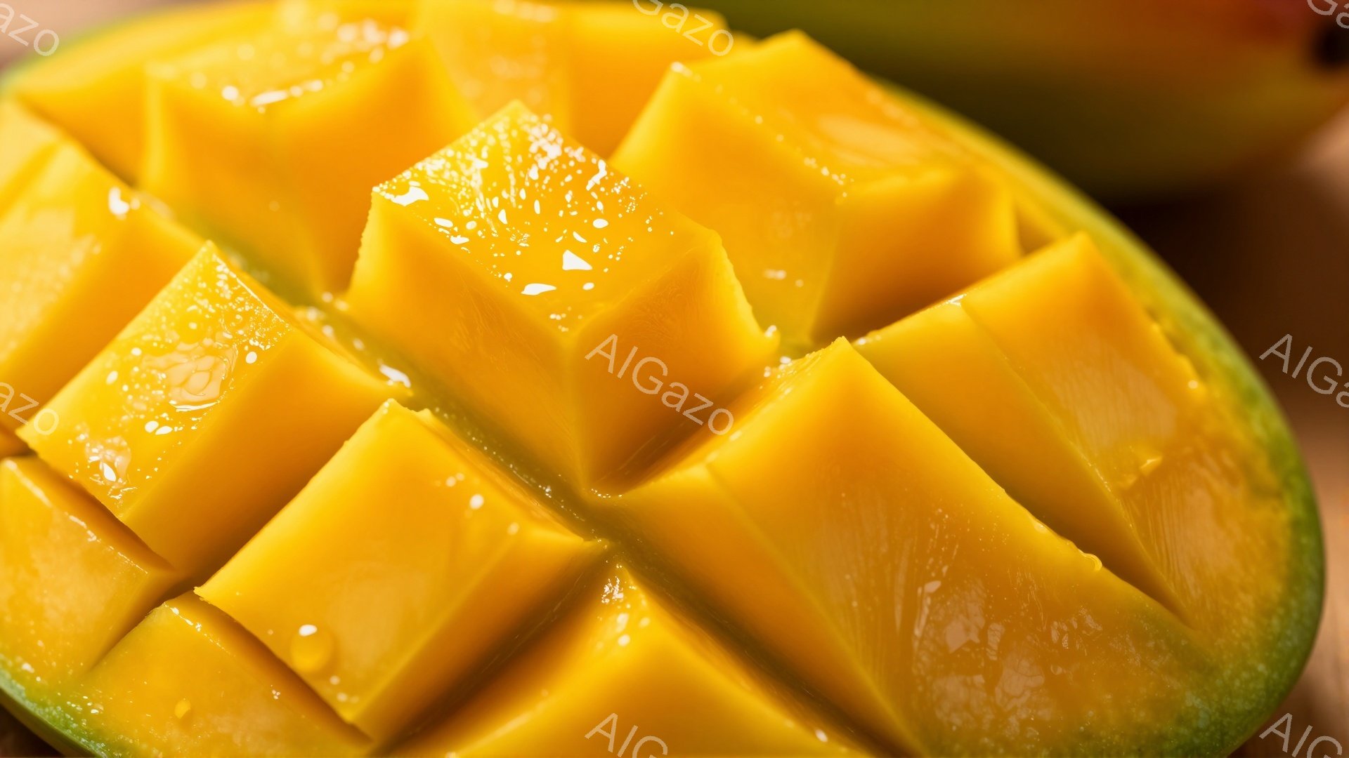 熟したマンゴーが格子状にカットされ、鮮やかなオレンジ色と黄色が目に飛び込んできます。果肉はみずみずしく、表面には光沢があり、美味しさを強調しています。背景は木製の板で、温かみのある雰囲気を醸し出しています。