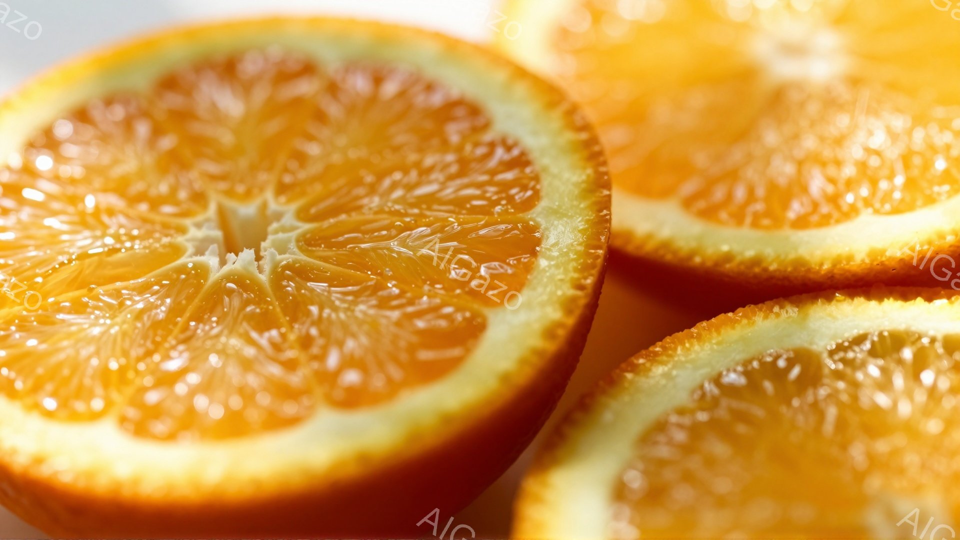 画像は、鮮やかなオレンジのスライスがいくつか並んだクローズアップ写真です。果肉はジューシーで、水分に満ち溢れており、オレンジの香りが漂ってくるようです。背景はぼやけており、オレンジの鮮やかな色が際立っています。