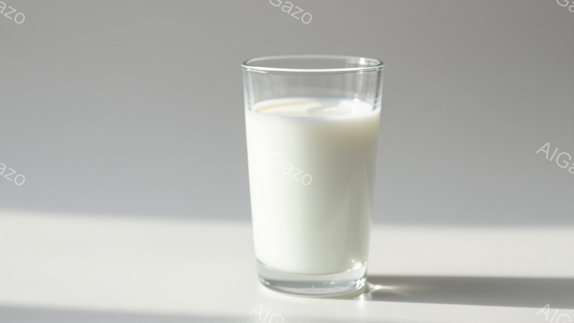 透明なグラスの中に白い液体が入っており、おそらく牛乳かそれに似た飲み物であると思われる。グラスは光沢があり、白いテーブルの上に置かれており、影がわずかに見られる。全体的にシンプルで清潔感のある、落ち着いた雰囲気である。