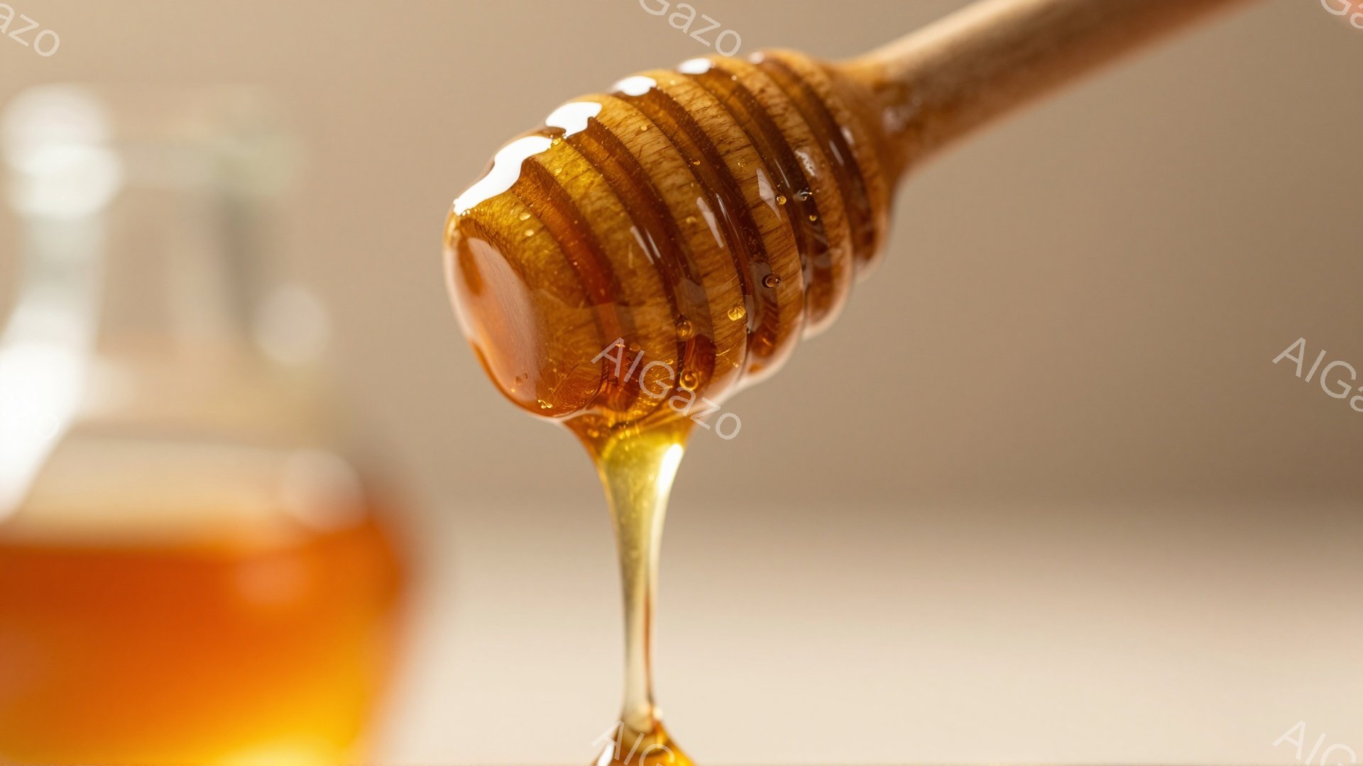 蜂蜜が滴り落ちる様子を捉えたクローズアップ写真です。背景には蜂蜜が入った瓶と、おそらく別の瓶がぼやけて写っており、全体的に温かみのある黄金色で統一されています。蜂蜜の粘性と透明感、そして光の反射が美しく、甘くて美味しい雰囲気を醸し出しています。