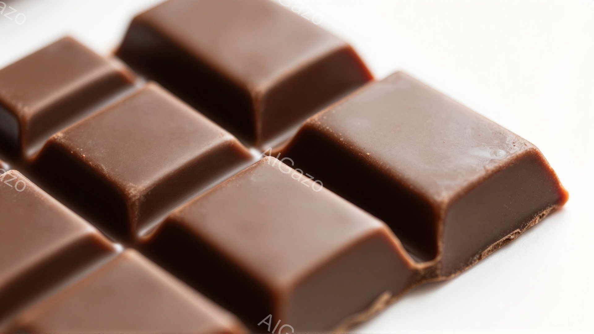白い背景の上に、四角いチョコレートが整然と並べられています。チョコレートは光沢があり、表面は滑らかで、美味しそうな茶色をしています。全体的にシンプルで、チョコレートの質感と色合いが際立つように構成されています。