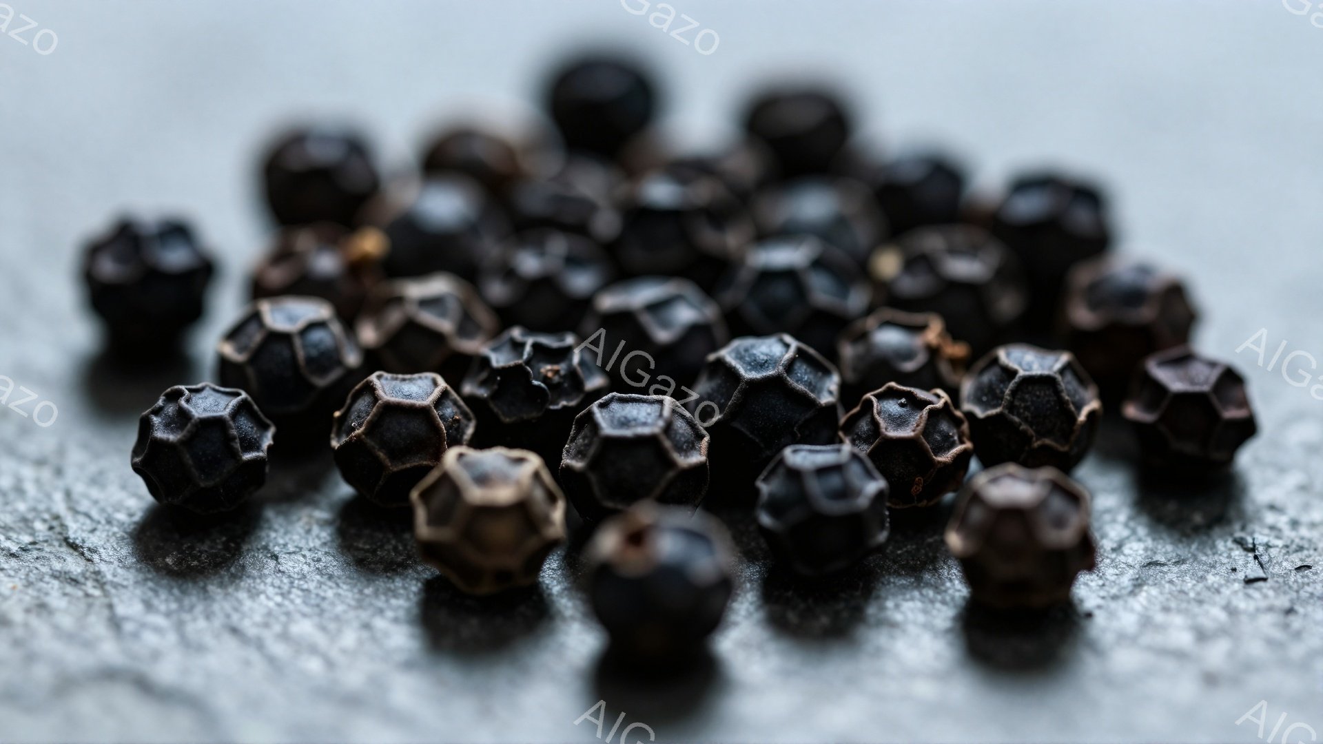 この画像は、黒胡椒の実が石のような表面に散りばめられたクローズアップ写真です。実たちは暗いグレーと黒の色調で、複雑な皺が特徴的です。全体的に、落ち着いた陰影があり、料理や食材のテクスチャを強調した、静物写真のような雰囲気です。