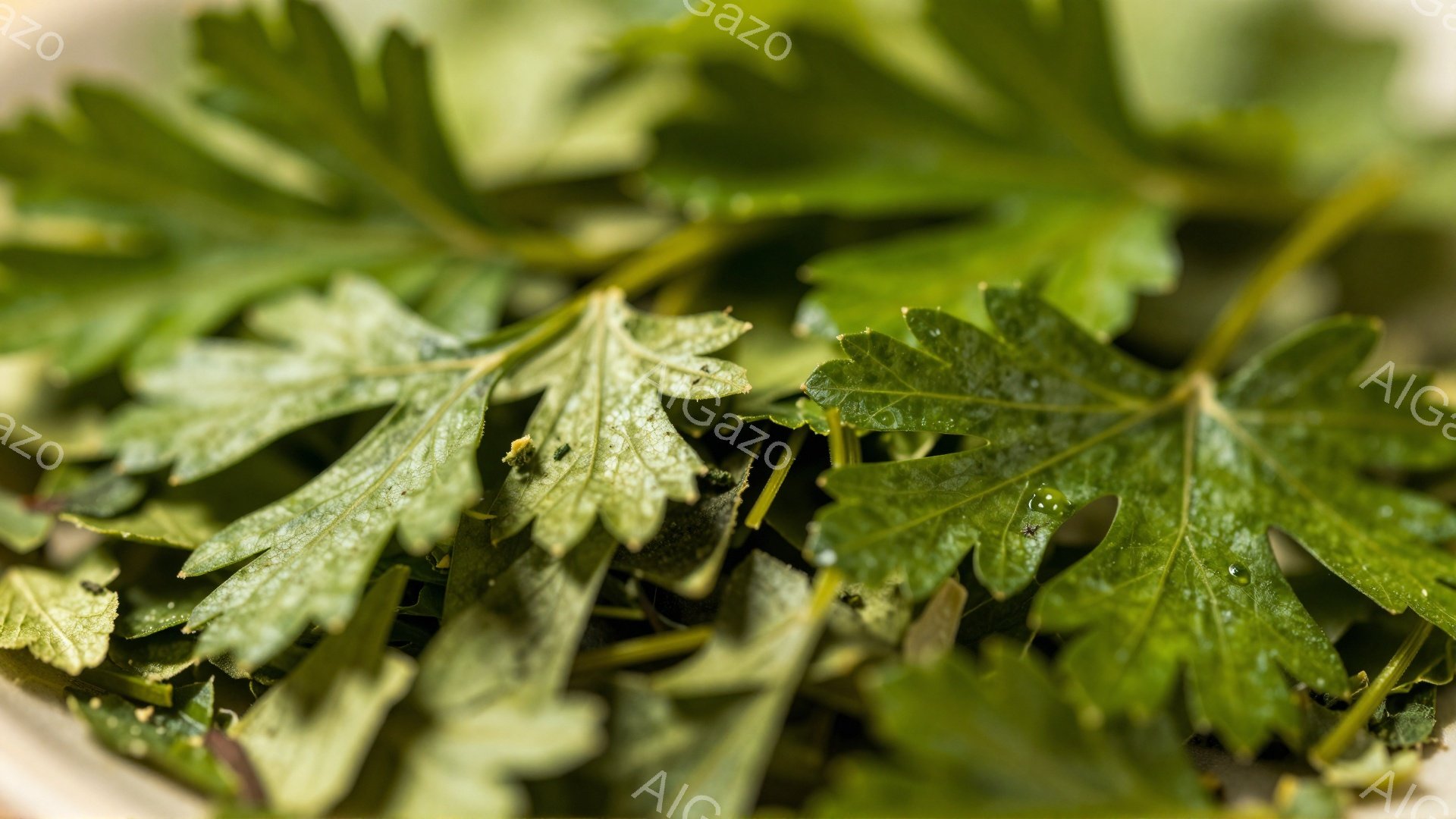 「鮮やかな緑色のパセリの葉が密集して写っており、葉の上には水滴が散りばめられています。光の加減で葉の質感や水滴の透明感が際立ち、瑞々しい印象を与えます。背景は白く」は、2025年12月07日に作成されたAI生成画像です。 クローズアップをテーマとした高品質なビジュアル素材で、 1920×1080px の解像度で提供しています。 個人利用・商用利用ともに無料でダウンロード可能で、クレジット表記も不要です。