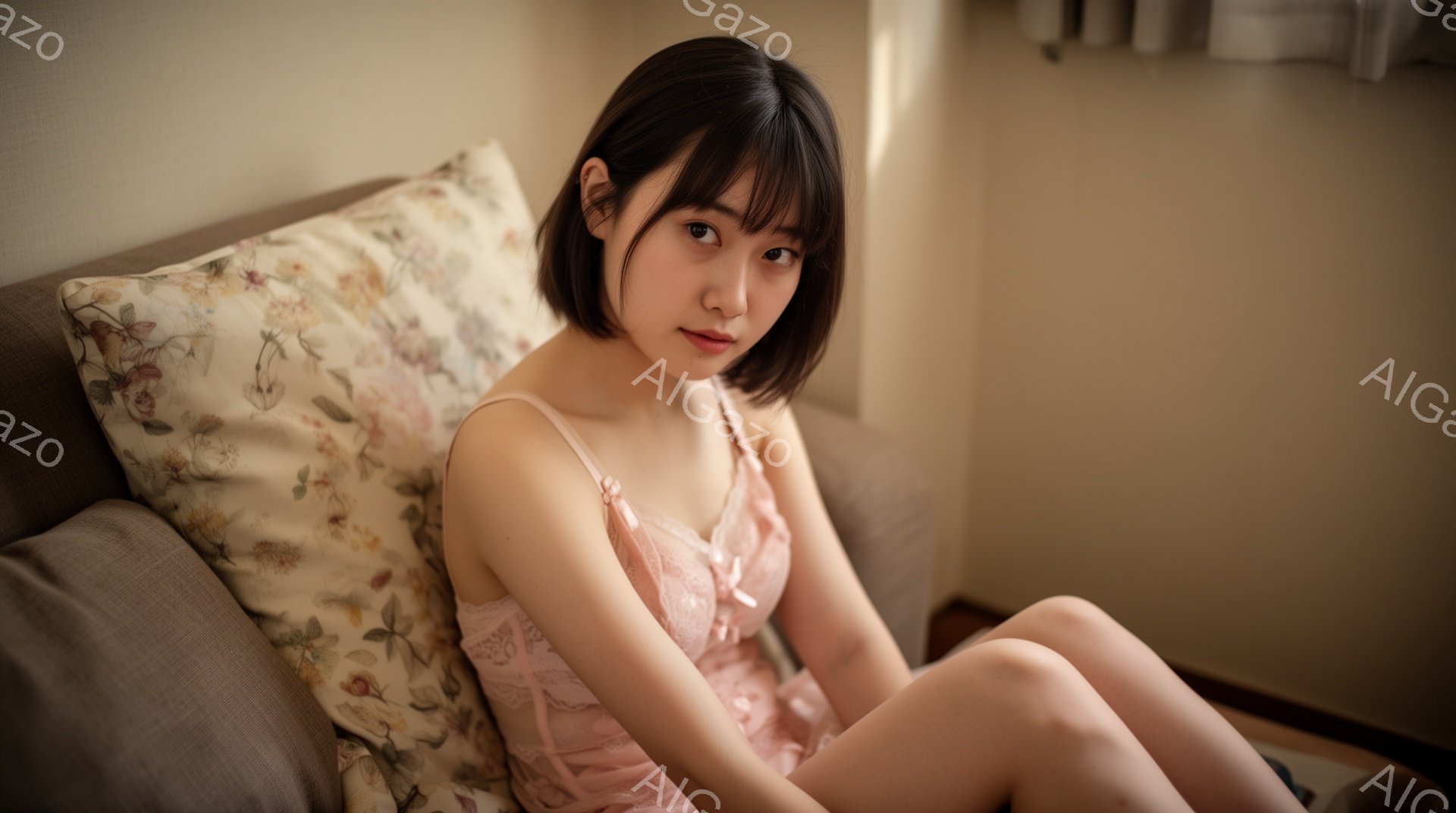 淡いピンク色のキャミソールワンピースを着た若い女性が、床に座ってこちらを見ている。彼女は肩までの長さのダークブラウンの髪を持ち、わずかに微笑んでいる。背景にはベージュ色のソファと窓があり、全体的に柔らかく暖かい雰囲気である。