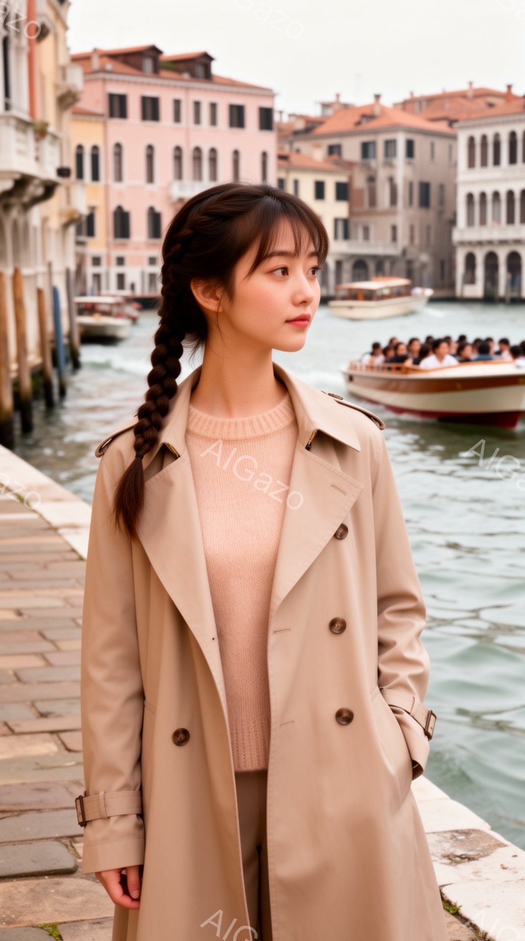 長い黒髪を編み込みにした若い女性が、ベージュ色のトレンチコートとベージュのセーターを着て立っています。彼女は少し上目遣いで、穏やかな表情を浮かべています。背景には、運河とカラフルな建物が並び、水面にはボートが浮かんでいます。