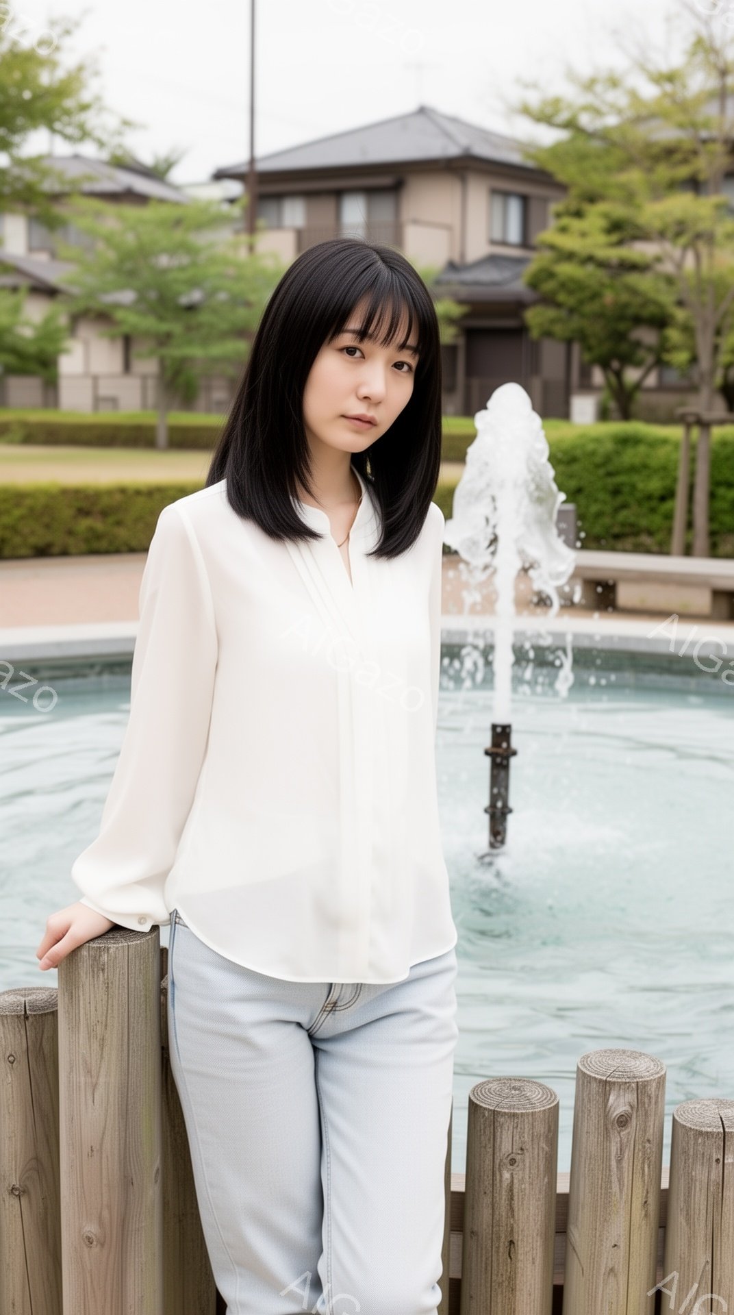 黒髪の短いヘアスタイルをした女性が、淡いブルーのデニムと白いブラウスを着て、木の柵にもたれかかって立っている。彼女は穏やかな笑顔でカメラを見つめており、背景には噴水と、伝統的な様式の建物が見える。全体的に、穏やかで明るい雰囲気の画像である。