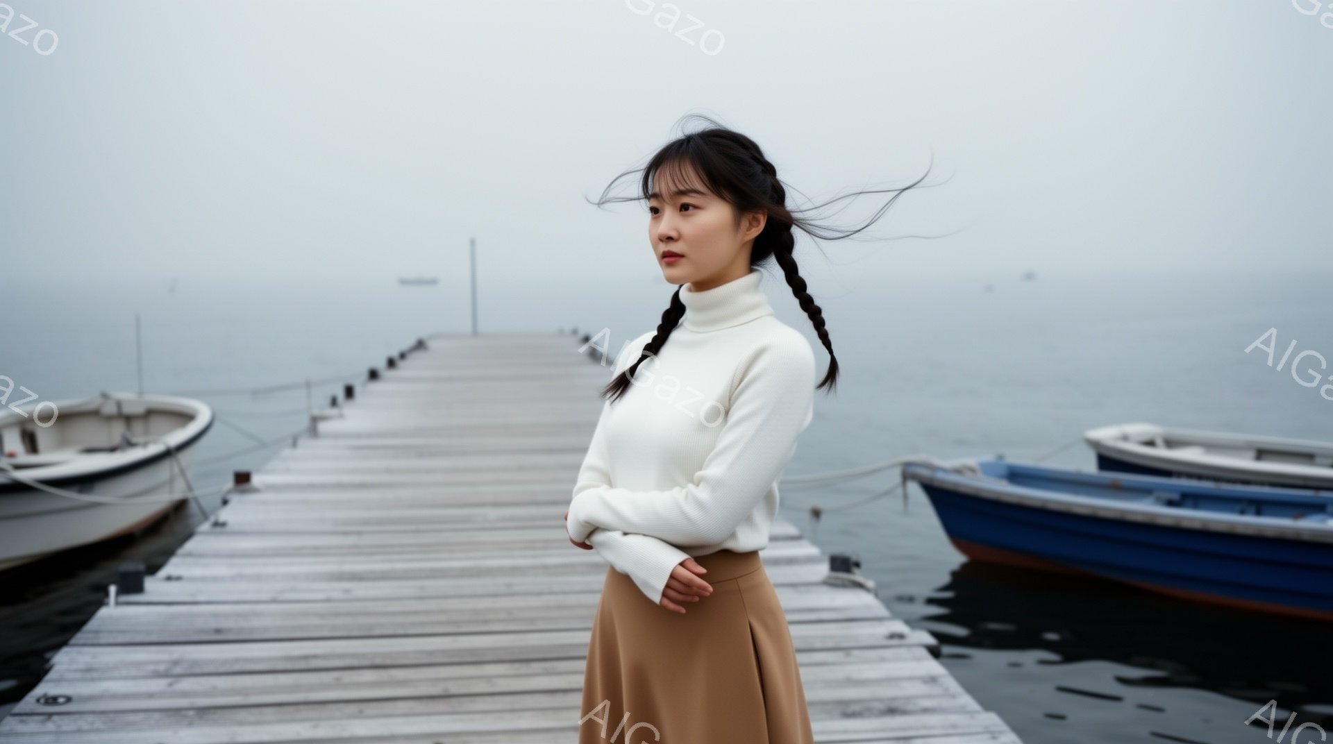 長い髪を二つに分けて後ろで結んだ女性が、桟橋の上に立っている。白のタートルネックセーターにキャメル色のフレアスカートを合わせ、穏やかな表情で正面を見ている。背景には、海に浮かぶ多数の小舟と、どんよりとした曇り空が広がり、全体的に静かで落ち着いた雰囲気を醸し出している。