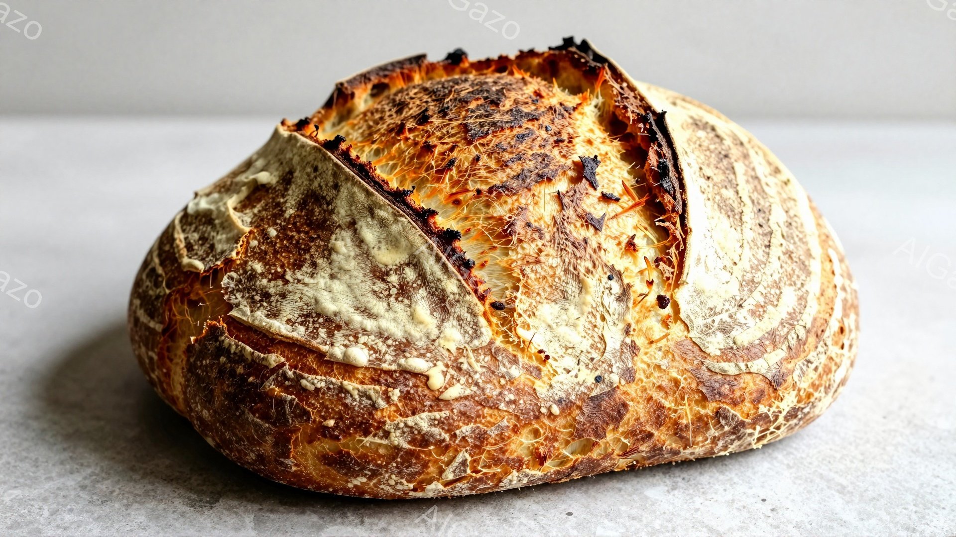 表面が濃い茶色でカリカリに焼かれた、丸いパンが写っている。パンの表面にはヒビや焼き目が入り、窯焼きパン特有の風合いが強調されている。背景はグレーがかった単色で、パンの色合いが際立っている。