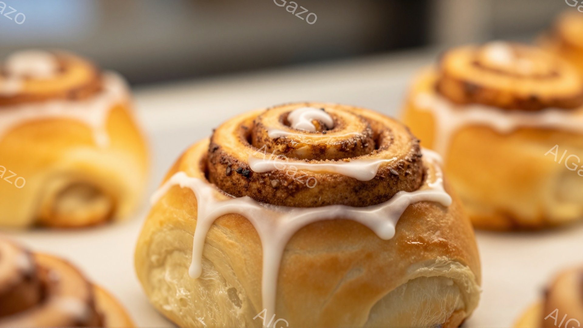 焼き立てのシナモンロールが金属製の天板の上に並んでいます。アイシングがとろりと流れ落ち、ふっくらとした生地の黄金色の焼き色が食欲をそそります。背景はぼやけており、暖かく、甘い香りが漂うような、おいしそうな雰囲気です。
