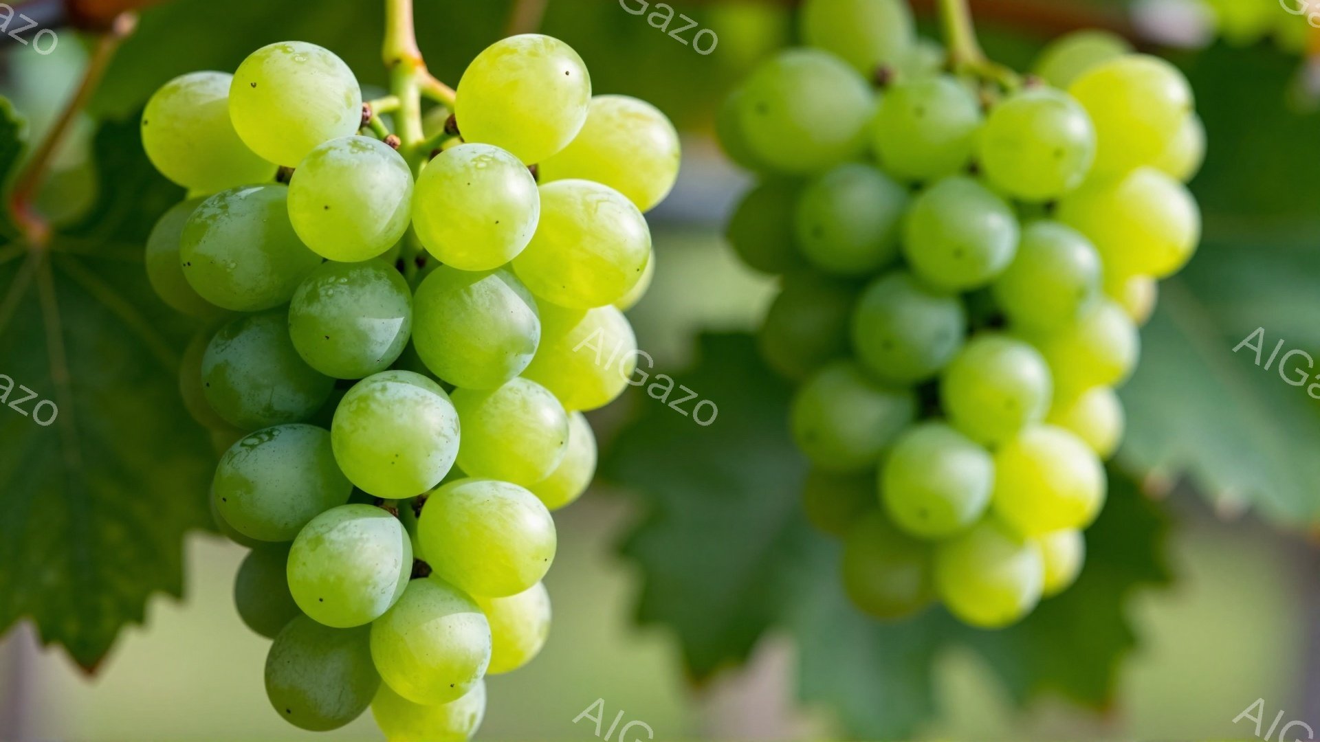 鮮やかな緑色のぶどうの房が、濃い緑の葉に囲まれてぶら下がっている。ぶどうの表面には水滴が光り、みずみずしさを強調している。背景には、ぼやけた緑色の植物が見え、自然の中で育った新鮮な果実の雰囲気が漂っている。