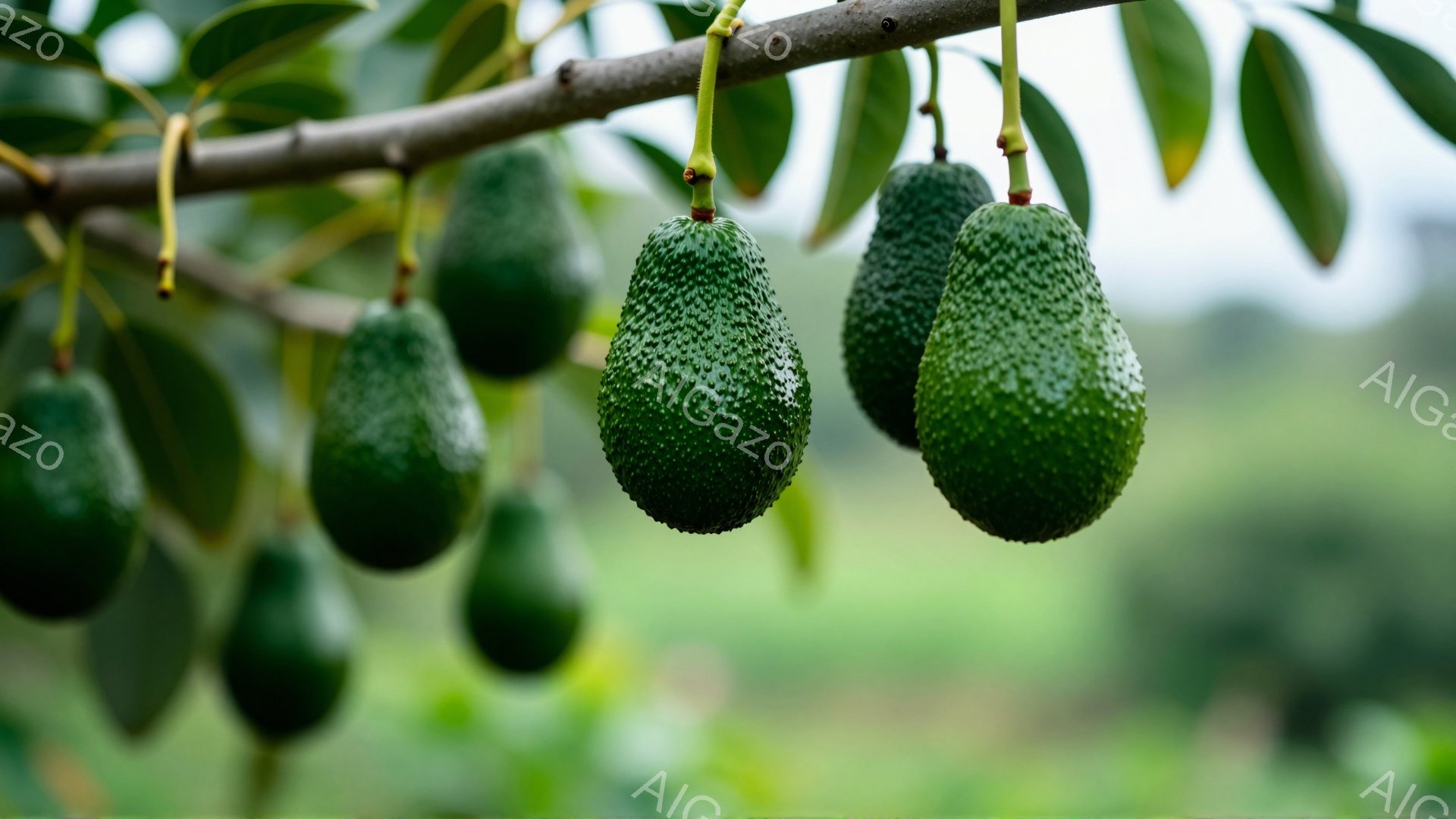 「アボカドが枝に実っている様子が写っています。緑色の実が密集しており、葉っぱも鮮やかで、背景はぼやけた緑色で自然豊かな印象です。全体的に温かく、穏やかな雰囲気で、」は、2025年12月08日に作成されたAI生成画像です。 アボカドをテーマとした高品質なビジュアル素材で、 1920×1080px の解像度で提供しています。 個人利用・商用利用ともに無料でダウンロード可能で、クレジット表記も不要です。