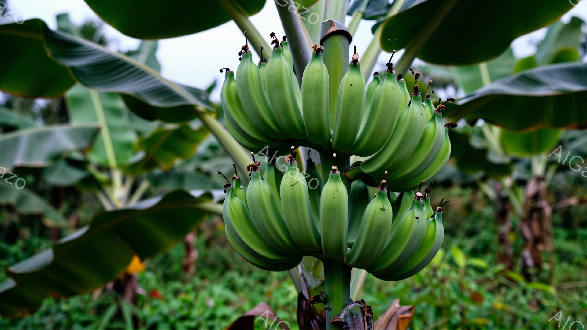 「鮮やかな緑色のバナナの房が、濃い茶色の茎に密集してぶら下がっている。周囲には大きなバナナの葉が茂り、背景には緑豊かな自然が広がっている。全体的に、熱帯地方の植物」は、2025年12月08日に作成されたAI生成画像です。 グリーンスケープをテーマとした高品質なビジュアル素材で、 1920×1080px の解像度で提供しています。 個人利用・商用利用ともに無料でダウンロード可能で、クレジット表記も不要です。