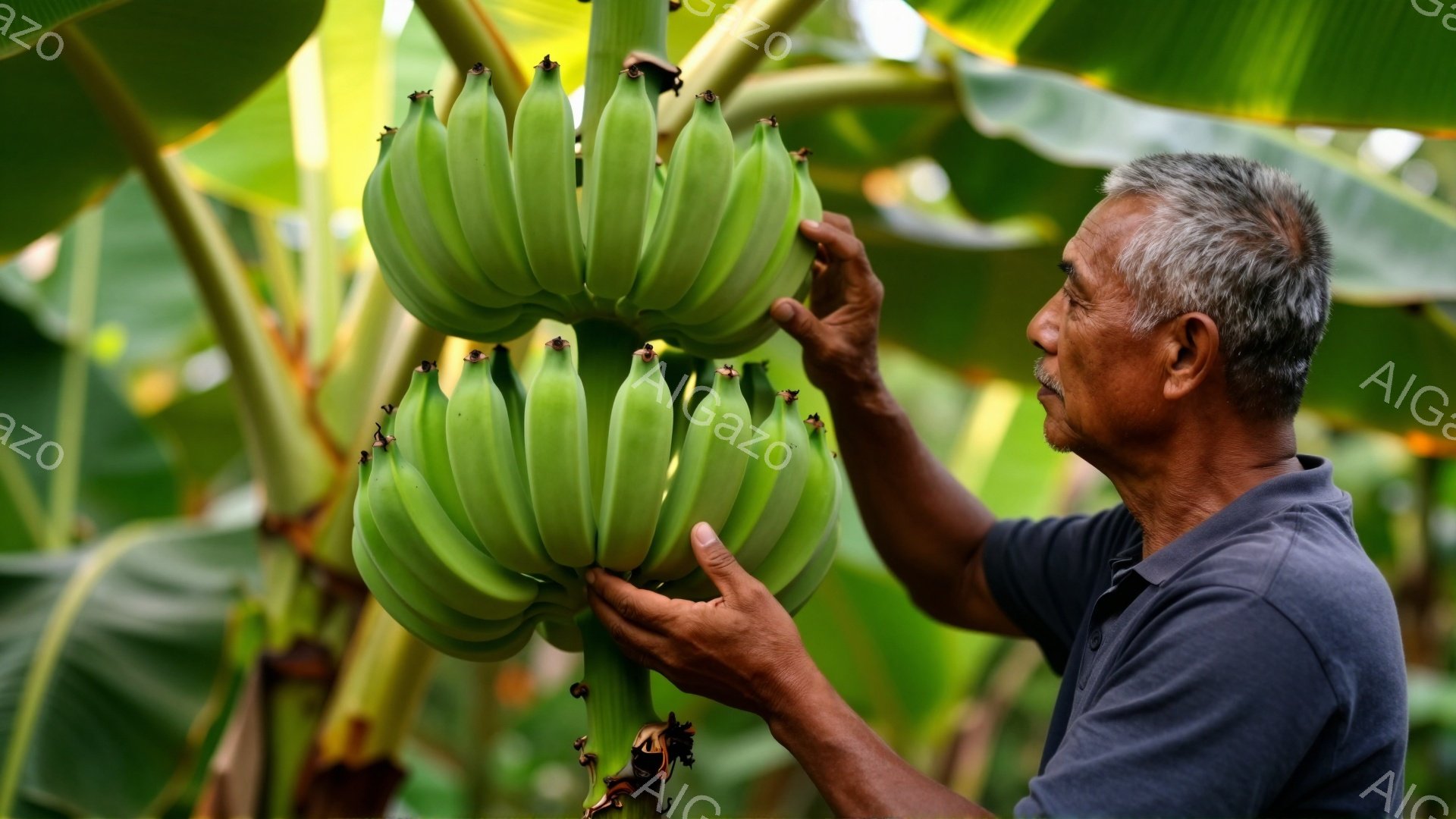 「画像には、麦わら帽子をかぶり、青い作業着を着た男性がバナナの木の下で作業している様子が写っています。彼は身をかがめてバナナの房を確認し、足元には鎌のような農具が」は、2025年12月08日に作成されたAI生成画像です。 アジアをテーマとした高品質なビジュアル素材で、 1920×1080px の解像度で提供しています。 個人利用・商用利用ともに無料でダウンロード可能で、クレジット表記も不要です。