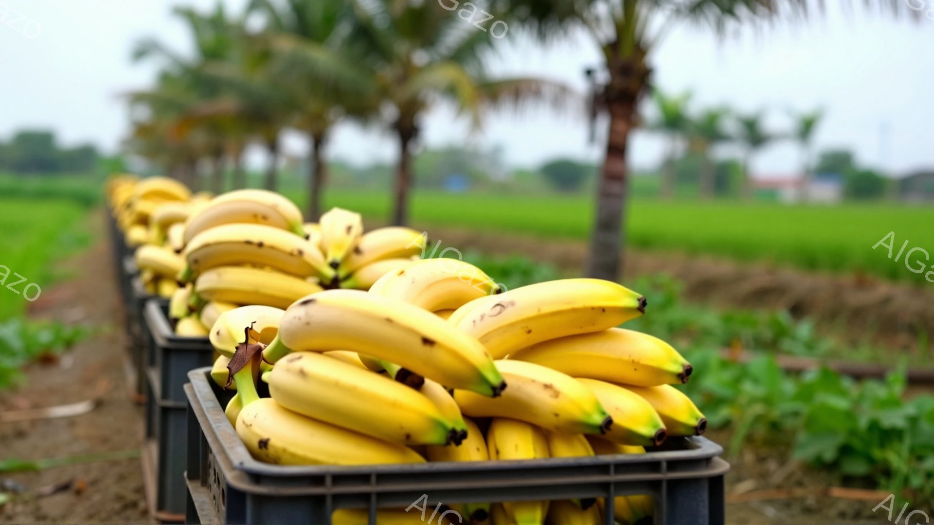 赤と黒の農耕トラクターが、バナナを詰めた黄色い箱を積んだトレーラーを引いています。背景には緑豊かな植物が生い茂り、夕焼け空が広がっています。全体的に、収穫されたバナナを運ぶ農作業の穏やかな雰囲気が漂っています。
