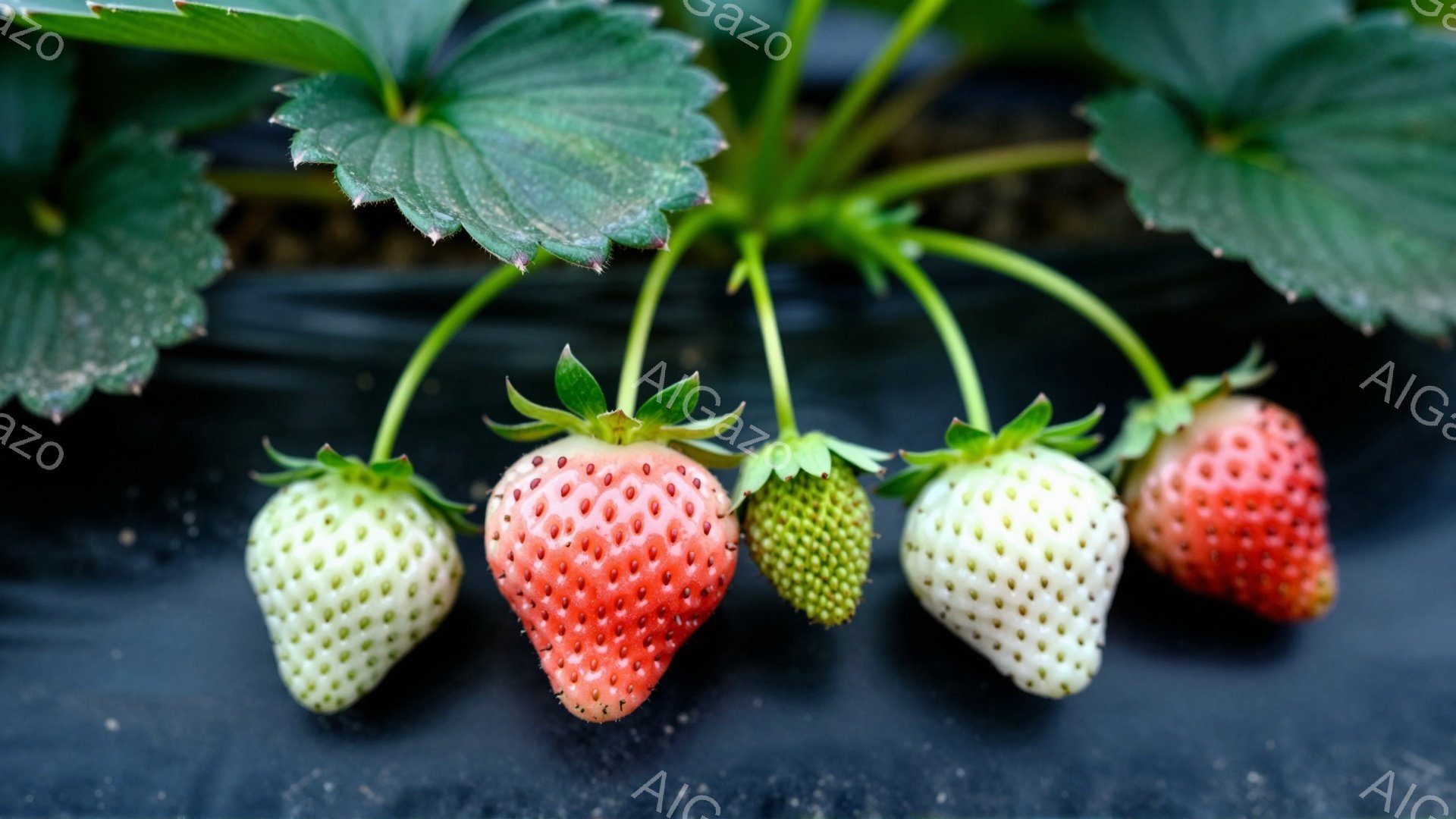 この画像は、イチゴが数個、黒いプラスチックシートの上で撮影されたクローズアップ写真です。中心には鮮やかな赤色の完熟したイチゴがあり、その周りには緑がかった白っぽいイチゴが配置されています。イチゴはそれぞれ緑の葉に囲まれ、全体的に瑞々しく、新鮮な印象を与えます。