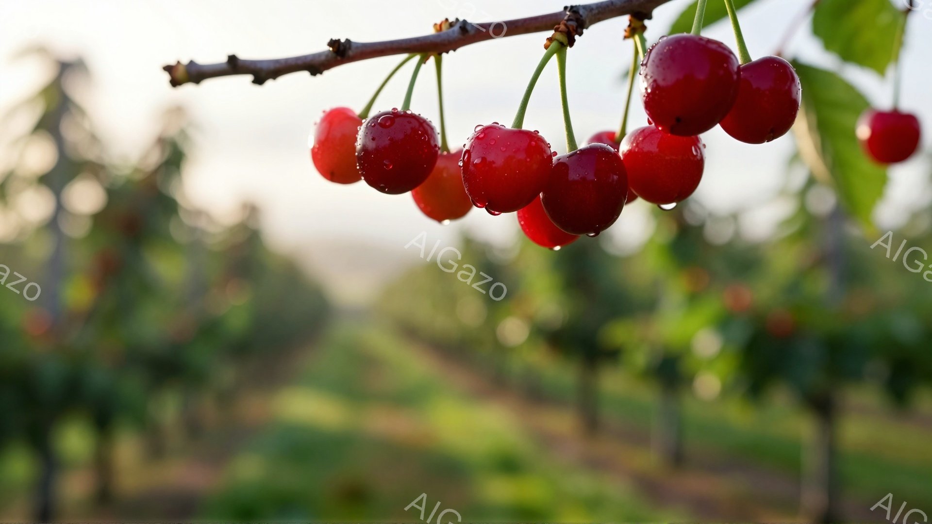 赤く熟したサクランボが枝に実り、雫が表面に光っている。背景には緑豊かな果樹園が広がり、明るい日差しが差し込んでいる。全体的に、豊穣で穏やかな雰囲気の美しい写真である。