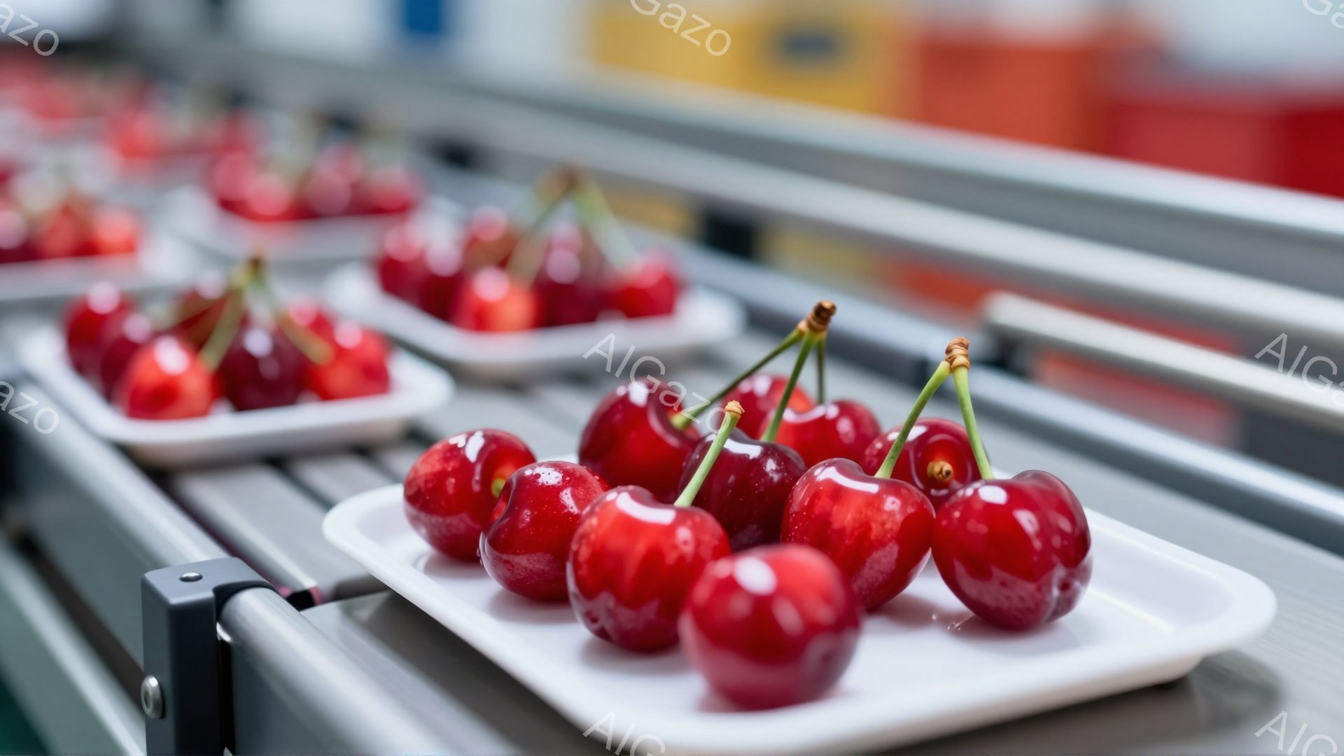 鮮やかな赤いサクランボが、白いコンベアベルトの上を整然と並んで流れています。サクランボは瑞々しく、光沢があり、一本一本が茎につながっています。背景は工業的な雰囲気で、コンベアベルトが続く様子が見え、サクランボの選別や加工が行われている場所であると思われます。